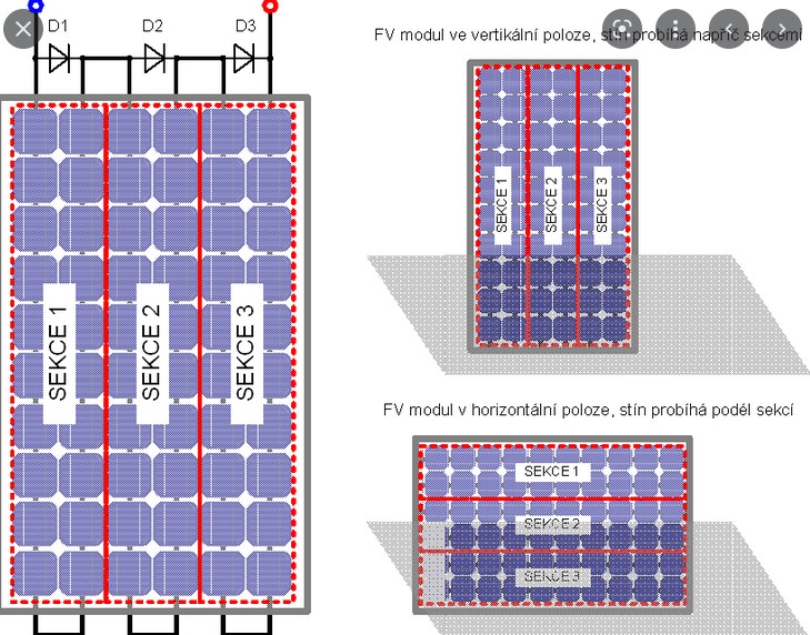U delenych panelu moderni konstrukce lze horizontalni ci vertikalni orientaci zajistit, ze pripadne stin zastini jen jednu cast panelu a nezabije jeho vykon uplne.