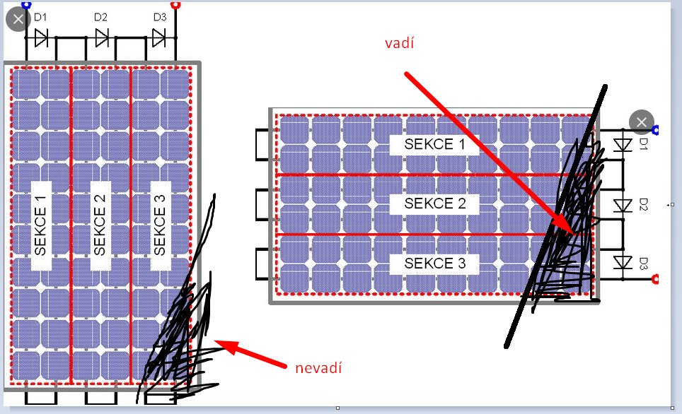 Řekl bych že ten vlevo bude spíš snížení skoro 33% a skoro vpravo 100%, ale novej panel bývá dělen jeste na půl, ale ano v obecné rovině je třeba zastínit co nejmíň "stringů" na tom panelu, jinak to bude míň jak difúze.