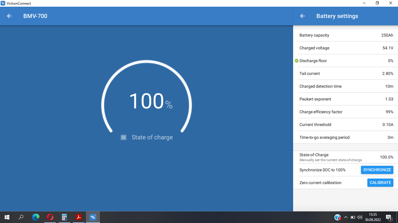 Nastaveni meho BMV700 je na prilozenem obrazku.Do dneska jsem mel nastaven jinak akorat Tail current -4% a Discharge floor -90%.Od rana jsem odpojil fve od domu i od panelu a pouze pres jeden menic nabijim baterky abych mel presny prehled o tom kolik toho do baterek nateklo.A jelikoz SA ukazuje,ze baterie mela SoC 100% ve 12:34 a v tuto chvili do ni jeste porad tece 5,5A,tak se obavam ze jsem pri pripojeni BMV700 do systemu asi nebyl dost trpelivy na kalibraci a tech 100% jsem zamacknul asi moc brzo.Kazdopadne za chvili to zkalibruju a vecer uvidim jestli nastala nejaka zmena nebo ne.