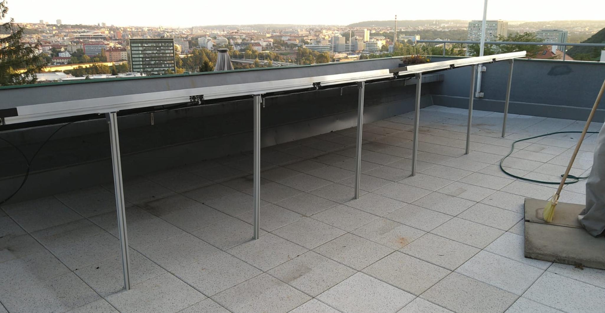 Pak - o 3 metry dál, je moje další elektrárnička - 2280Wp, již na "mé" terase: Samozřejmě, že povrch terasy je taky ve společném vlastnictví, nedávno se rekonstruoval za peníze všech. I tuto elektrárničku jsem upevnil tak aby jí bouře neodnesla, ale zároveň bez jediného vrtu do baráku. O této elektrárničce ani popel. Protože dokud tu platím nájem, je to moje terasa a jestli si tam dám panely, nebo tam budu lítat jako na sabatu je moje věc.
