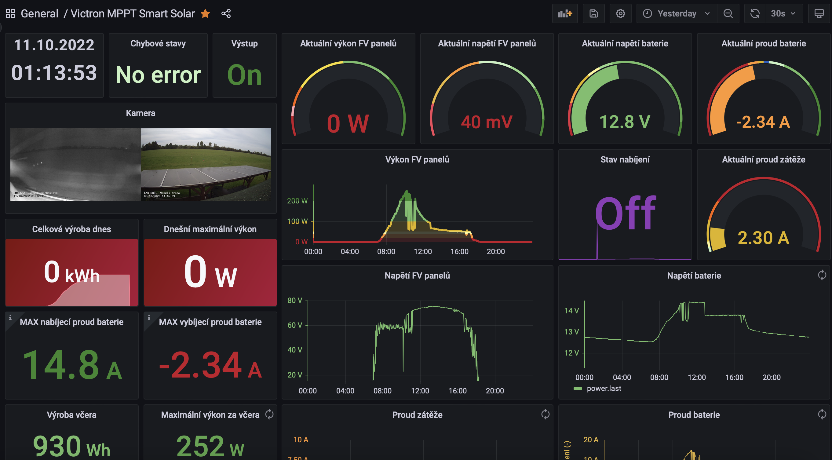V příspěvku je popsáno zprovoznění čtení dat z Victron MPPT regulátoru přes VE.Direct rozhraní na Raspberry Pi 2 Model B. Data jsou získávána pomocí Python skriptu, který zapisuje hodnoty do InfluxDB, a následně vizualizována v Grafaně. Popisuje se také hardware včetně SSD disku a PoE napájení, stejně jako úpravy skriptu pro autentifikaci k databázi.