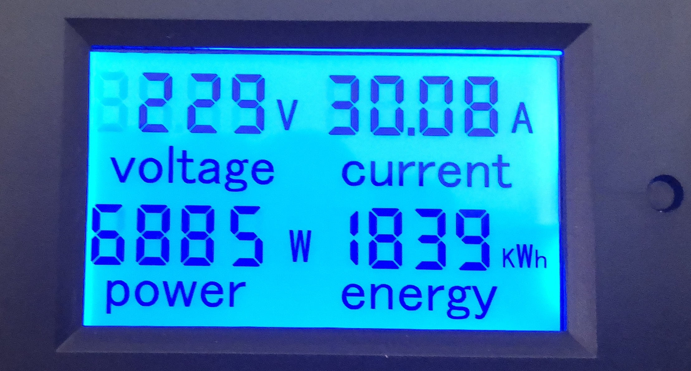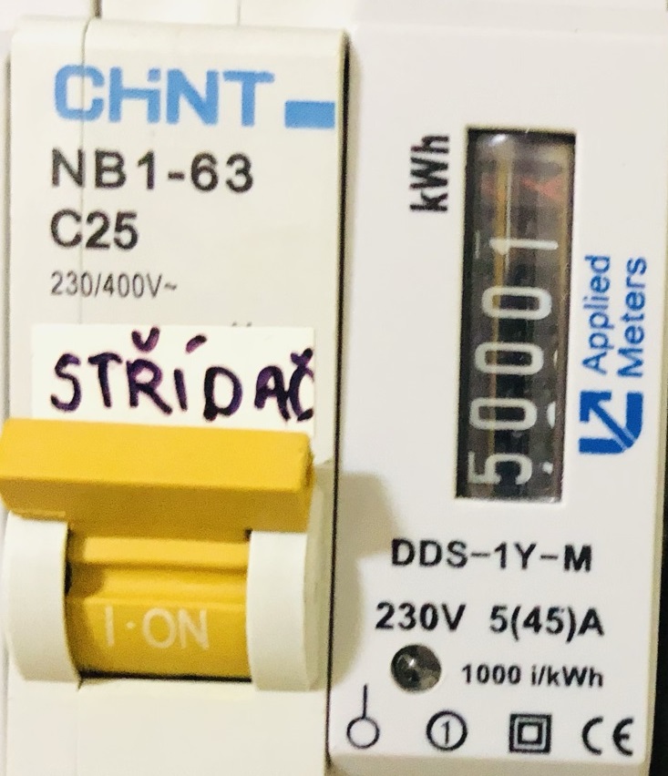 Pro přehlednou kontrolu střídavých parametrů na výstupu elektrárny jsem osadil také měřidlo napětí, proudu, výkonu a energie, u kterého provádím nulování naměřené energie jednou ročně, jelikož nemá dostatečný rozsah měření pro trvalý chod bez nulování.