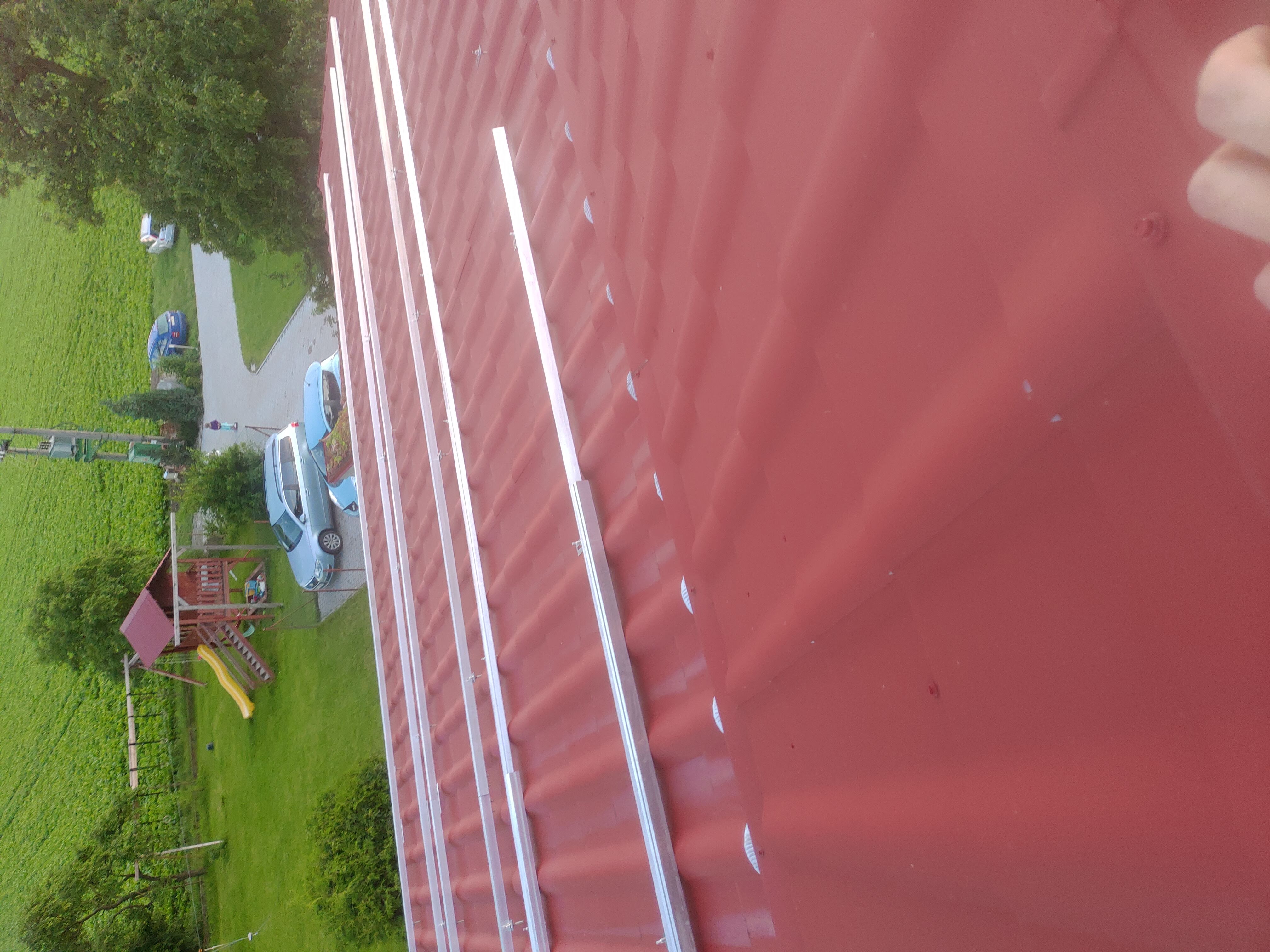 Okem to uvidím ale pouze z kraje nebo větší vzdálenosti, těžko v tom místě co to rovnam, po střeše se pohybuji po matracích zavěšen na laně, takže z prostředka polezu na kraj abych se podíval, ale jak pak zkouknout rovinu výškově? Dole pod střechou je garáž, na kterou se nedá pořádně vlézt a shora kouknu až když budou všechny profily namontované