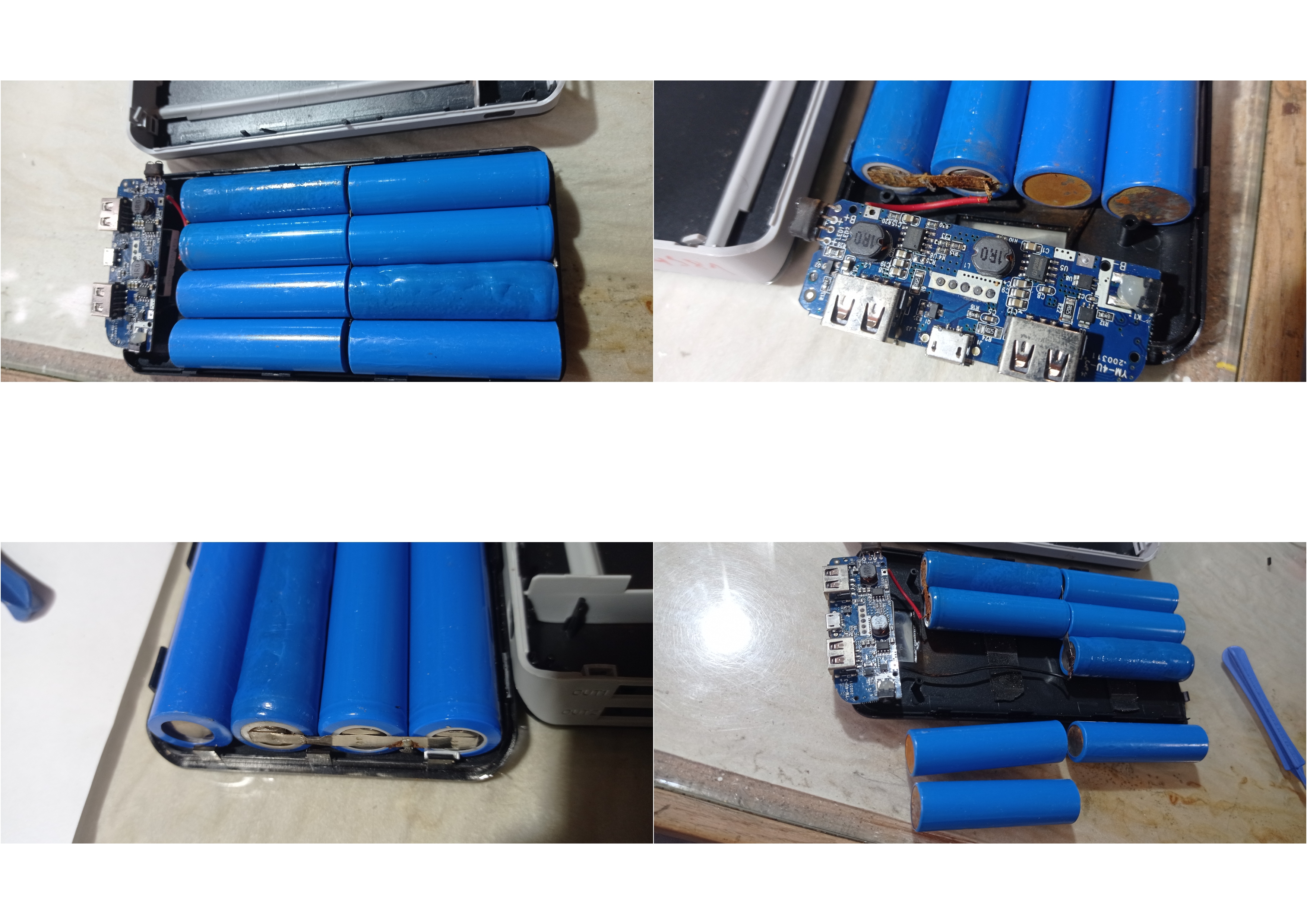 Powerbanka přišla úplně vybitá. Nabíjení šlo jen proudem 0.8 A, tak jsem předpokládal, že pro 30 000 mAh to bude nějaký den trvat. Vešlo se do ní jen 4 000 mAh. Po rozebrání vidím všechny články rezavé, na dvou nafouklý obal s elektrolytem a tři články vůbec nezapojené. Některé "články" byly naplněny pískem. Elektronika měla podporovat rychlonabíjení, ale byly tam normální čipy pro nabíjení 5V/2.1A. Prodejci jsem dal dva dny na reakci - přečetl si to, ale nereagoval.