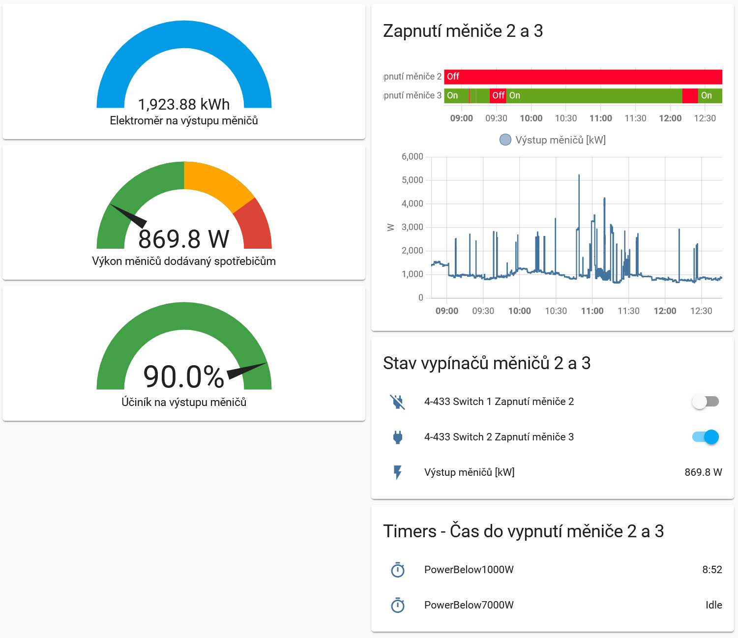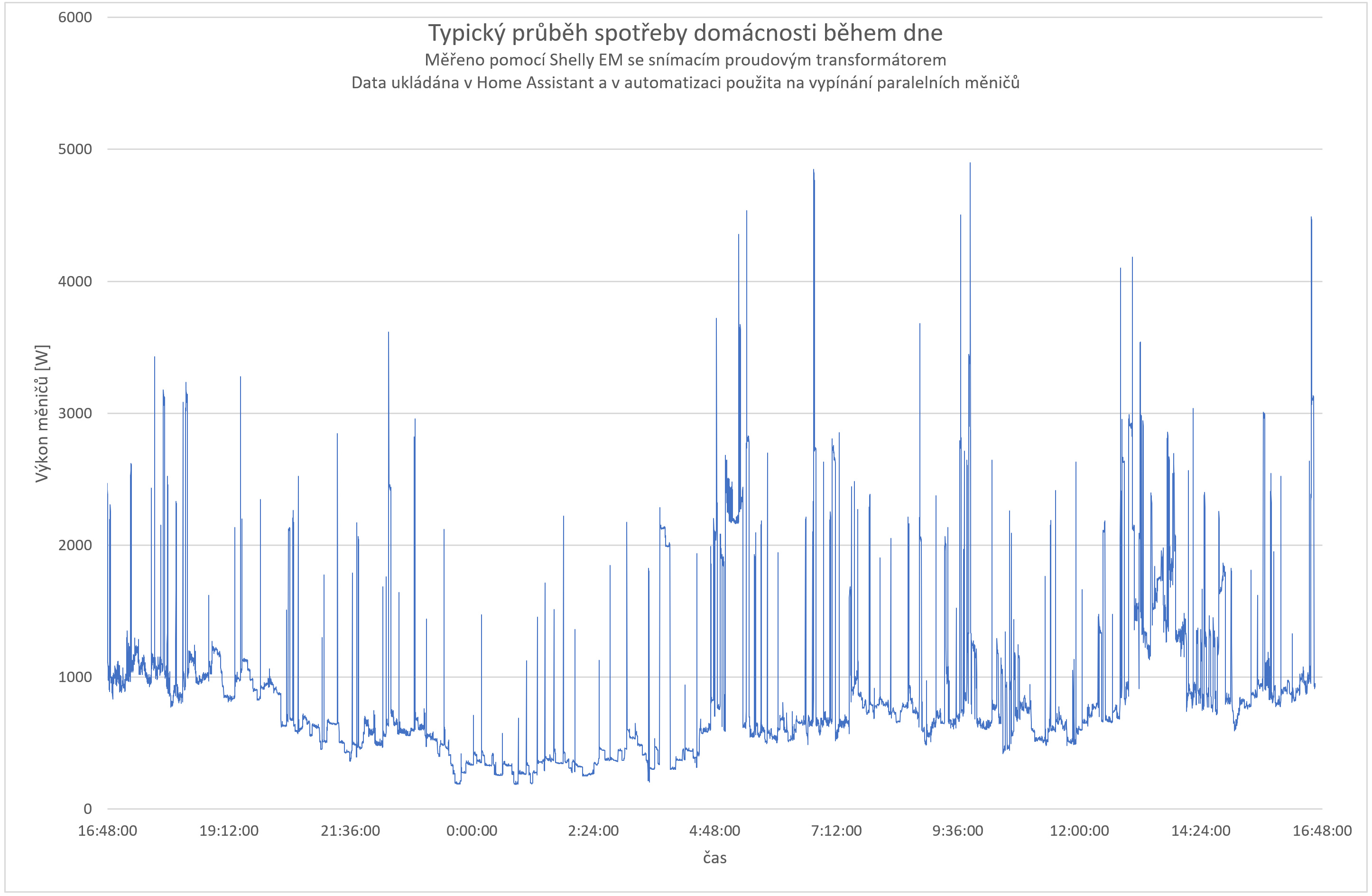 Výsledek pak může vypadat nějak takto - spínací hranice je nastavena na 2000 W, ale na některé píky systém nereaguje a další měnič nezapne. Zapne až při delším překročení meze v 17:35: