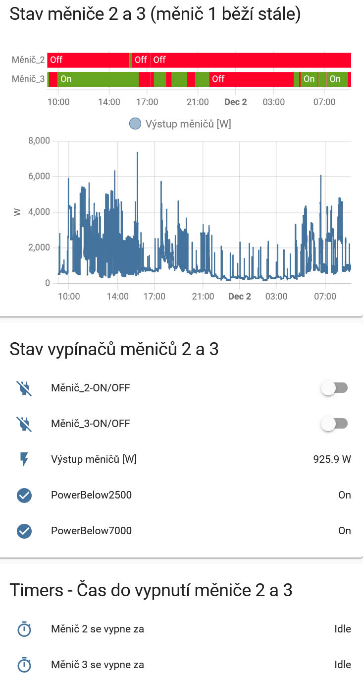 U paralelně zapojených měničů mám už snad konečně nastaveny limity tak, že jsem s chováním spokojen. Po dlouhé době se v baráku podařilo dosáhnout souběhu přes 7 kW, takže se připojil i měnič_2, který jinak pracoval jen jako mppt regulátor.