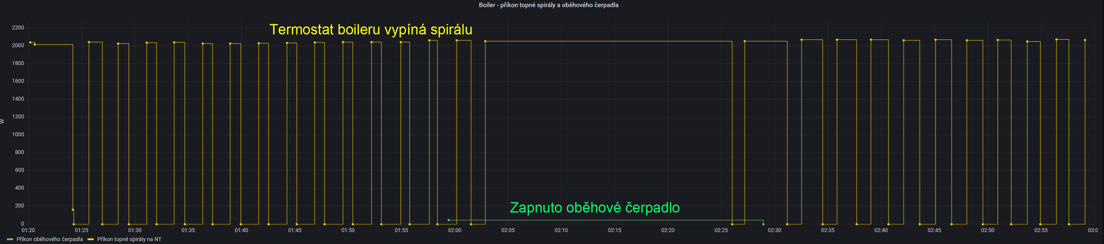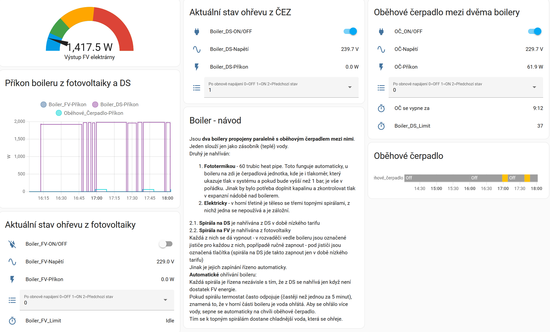 Tak automatizace hotova, jen bude potřeba to optimalizovat. Šlo to vše nacvakat v HA v UI. Zavedl jsem helper Timer (5 minut) a pokud byla doba, po kterou byl dodávaný výkon do spirály boileru kratší, tak se na chvíli (10 minut) sepnulo oběhové čerpadlo. Vyzkoušeno na ohřevu z nízkého tarifu, ale tam to vypnu, protože není potřeba elektřinou od distributora nahřívat moc vody.