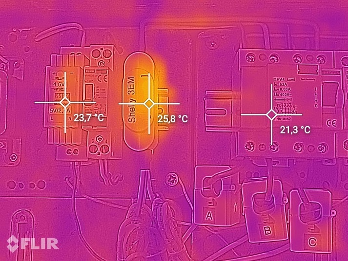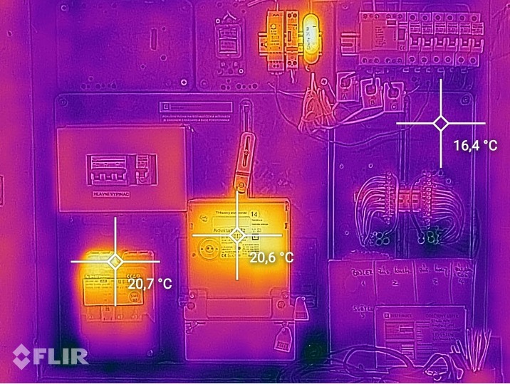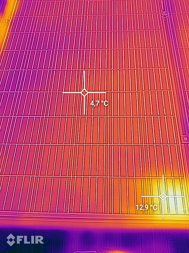 Trošku mimo, ale prohlídnul jsem termokamerou za provozu i měnič a ukázalo se, že jeden MC4 konektor na přívodu z panelů do měniče má horší dotek a je o 10°C teplejší než zbývající tři. Tak jsem trochu přimáčknul kontakt v konektoru a potom už měl stejnou teplotu jako zbytek (byl studený). Celý problém byl v horším kontaktu ve spoji těch dvou konektorů. Ale bez termokamery bych na to asi nepřišel.