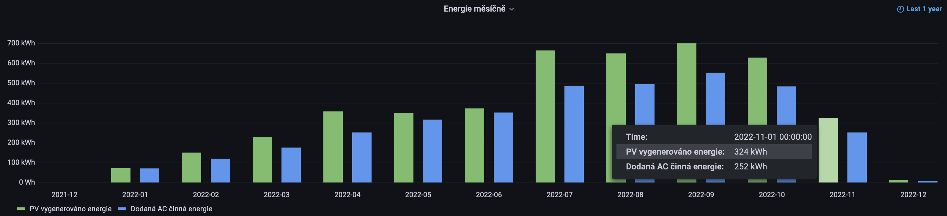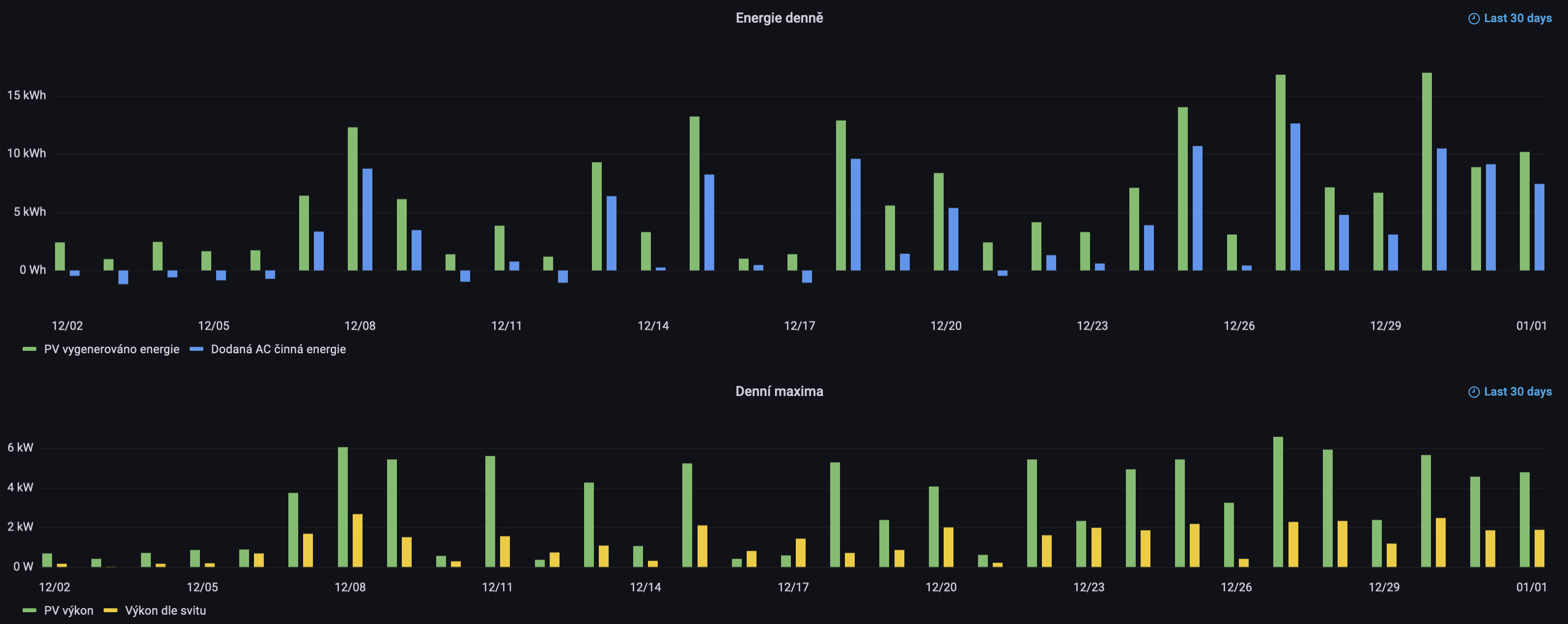 Během dní, kdy se objevilo slunce, jsem generoval aktuální výkon přes 6.57 kW na PV straně. Tedy zhruba 76% instalovaného výkonu panelů. Zejména na začátku prosince bylo hodně dní, kdy se generovalo naprosté minimum. Nejmenší aktuální maximální denní výkon byl 365 W během 12. prosince.