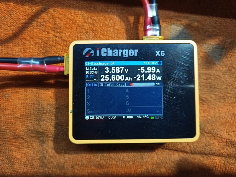 Ještě před tím mi ale dnes dorazila modelářská 30A nabíječka s regenerací 30A a tak jsem nabil jeden samostatný článek z rozebrané kostky na 4.1V a nechal vybíjet 6A (0.25C) a za 4hod 20min z něj vylezlo přez 25Ah a napětí ještě nedošlo ke třem voltům.Takže to budou minimálně 30Ah články v těch kostkách z kterých se skládají páry,i když je na štítku 50Ah.Ve skutečnosti tedy bude minimálně 60Ah.Dokončit do 2.8V jsem to již nestihl,nový majitel si bral vše.Tak ať slouží.