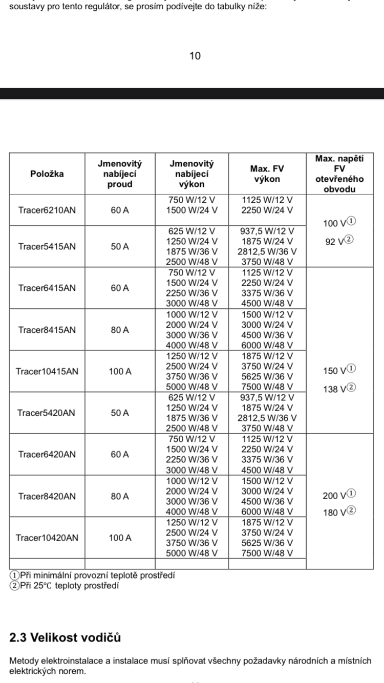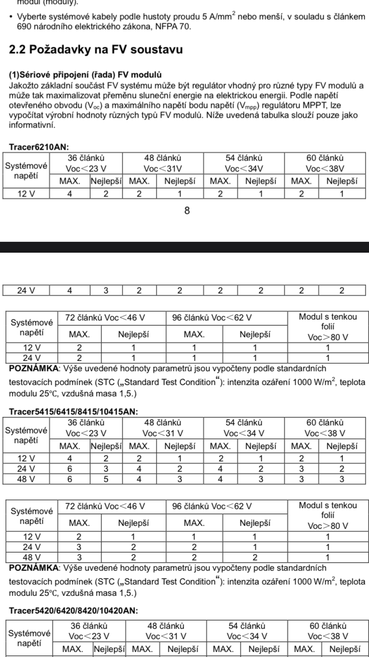 No 10 panelů se po třech zapojit nedá. Takže dva panely do série, a to celé 5x paralelně. Proudově i napěťově v pohodě. Váš Epever umí 80A a potřebuje z panelů alespoň o 2 volty víc, než má baterka. Nechce se mi kontrolovat napětí panelů pro 50°C, ale mělo by to ještě vyjít. Akorát se od panelů k Epeveru musí táhnout víc kabelů, poteče tam přes 50A, je třeba zkontrolovat průřezy.Migel píše:Teraz ich mam zapojene do serie ale len do bojlera.,idem to prerabat a mam celkovo 10 kusov panelov