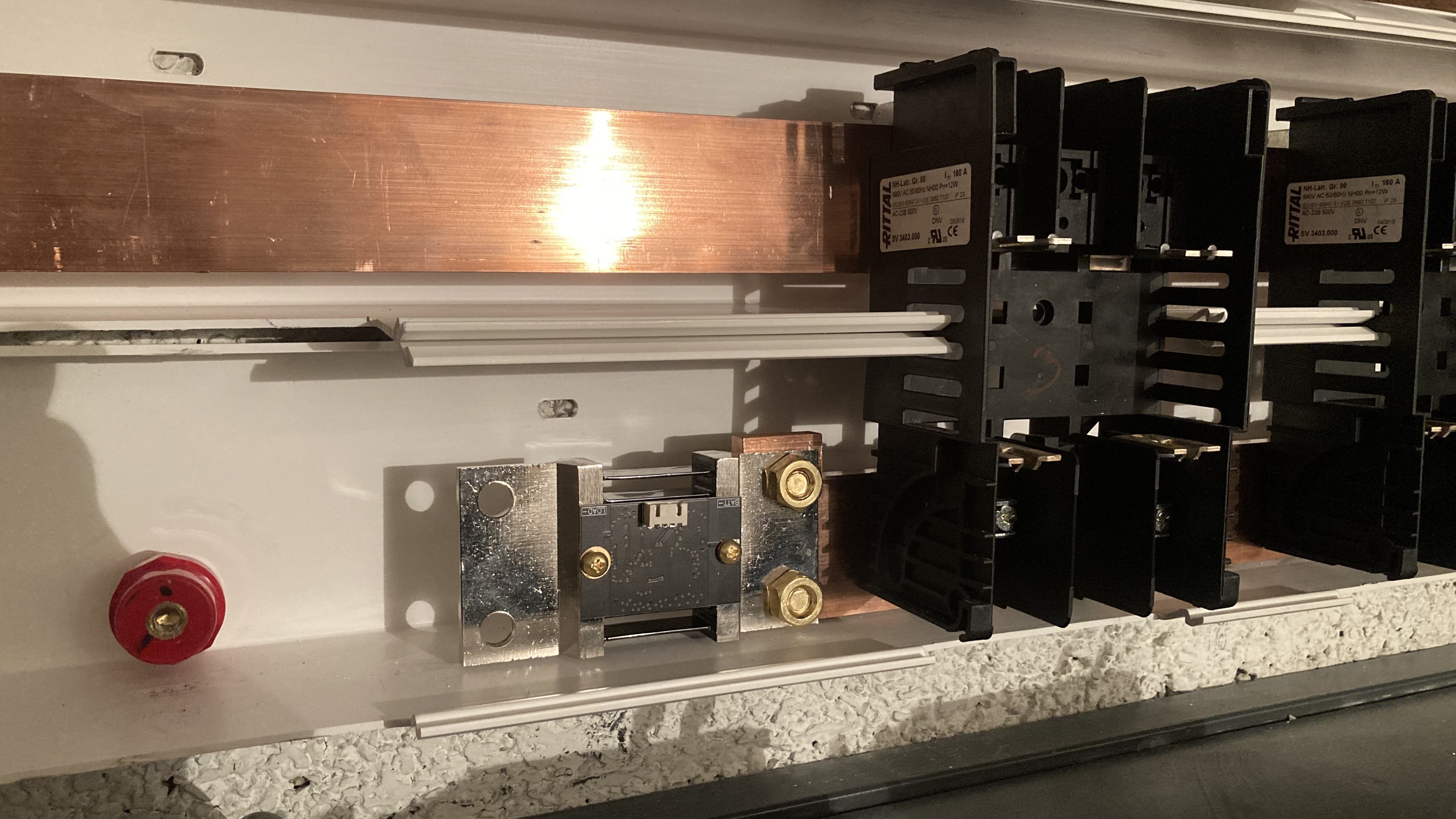 Vsetky odpajace su na busbaroch o rozmere 5cmx1cm a dlzke 2m (su na 800A alebo vysie uz si to nespomeniem presne)a to aj tie odpajace na menic a reg. Prva a posledna baterka su od seba 140cm neviem ako inak sa da vyriesit ak su baterky paralelne..je jedno ci sa davaju nad seba do skrine alebo vedla seba do police stale tam bude rozdiel medzi prvou a poslednou.kable mam od kazdej baterky rovnakej dzkyplusy aj minusy preto to vyzera skrutene tie kable..