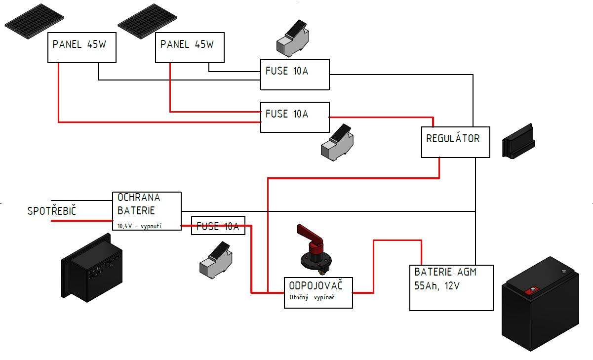 Ok, takže úplně jednoduše. Prostě nejdřív odpojím panely pomocí toho pojistkového odpínače a potom až mohu otočit vypínačem na baterii. Při zapnutí opačný postup. Nejdřív zapnu baterii, potom zacvknu pojsitky u panelů.