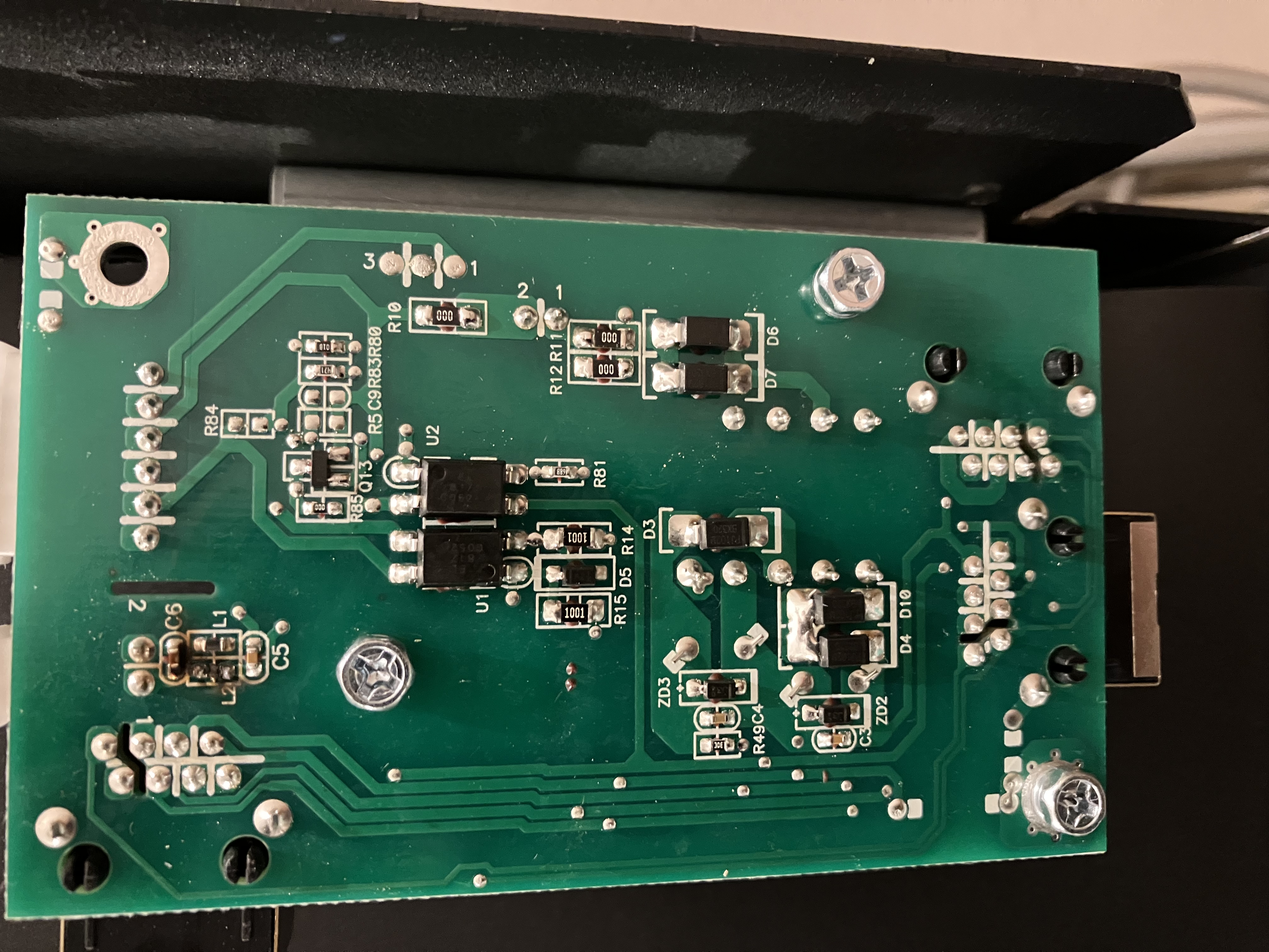 sa mi podarilo tak nešťasne škrtnúť hnedý kabel s ovládacieho panelu o - pól batérie, že som odpálil nejáké súčiastky L 1, L 2, asi aj C 6 nad horným šróbom je to vidno na foto.