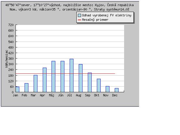 Po zadani souradnic, sklonu strechy a odklonu od jihu mi to na http://sunbird.jrc.it/pvgis/apps/pvest. ... map=europe .. vyplivlo toto: