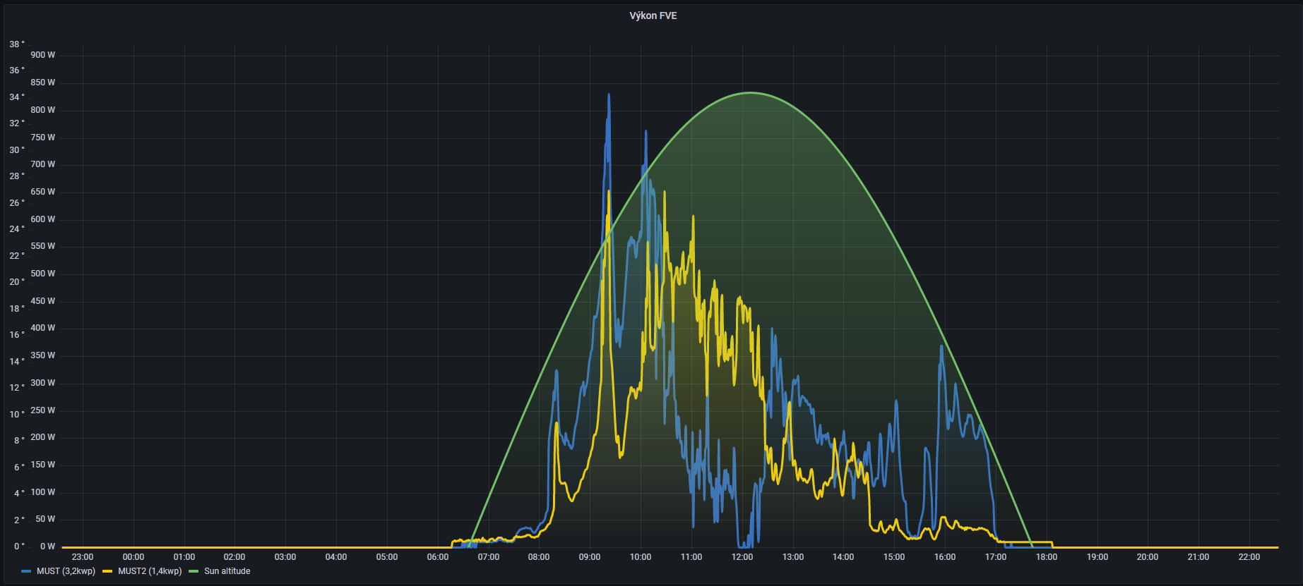 Jojo je to tak odpojí to MPPT ten se sice nevypne, tak jako v noci ale vyřadí se z činnosti. Další problém nastává když jeden měnič jede větší odběr a napětí na baterce klesne pod nějakou hranici zatím jsem nevypozoroval kolik... Potom se stává že jeden měnič je ve floatu a druhý v bulk takže ten v bulk natlačí napětí na bulk hodnotu a druhý co je ve floatu opět vypne MPPT protože má hranici baterie vyš než je float. Ten bulk a float si stejně dělá co chce... Málo který den měniče jedou fázi BULK z 90% dosáhnou jen urovně float a začnou omezovat a žádný bulk ten den nenastane. Podle mě je to podmíněno nějakým poklesem baterie pod určité napětí... protože bulk se dá vyvolat tím jak popisuju, že třeba přijde mrak a jdou 2kw z baterie, napětí na baterii spadne třeba na 24,4V nějakou chvíli to tak je no a potom je rázem ve fázi bulk, když je den co jsou hodně mráčky střídající se ze sluncem, tak dokáže proběhnout bulk i 3x v jeden den. Jen s různě dlouhým časovým intervalem.