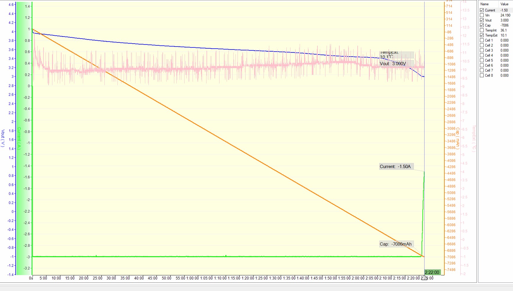 netuším co to je přesně za chemii, přikládám graf z měření jednoho článku. V rozsahu 4-3V naměřena kapacita 7Ah. Cena 1.500Kč