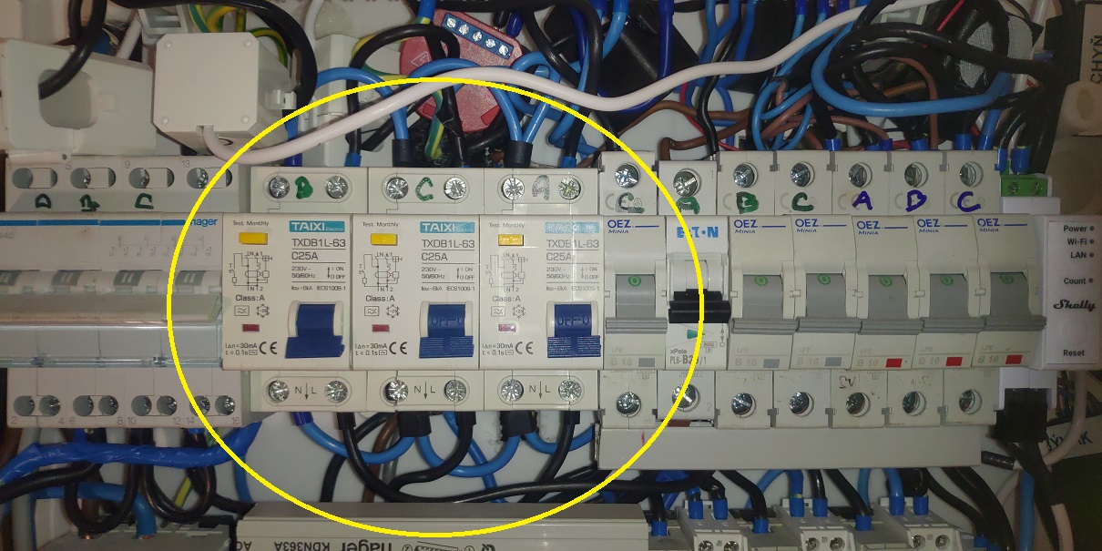 Zkusil jsem zapojit i samostatné okruhové nuly bez bodu spojovacího můstku a taktéž se to navzájem vyhodí. Možná tím, že jsem nechal pospojované vstupy, protože do tří větví to rozděluji z jedné fáze jako při klasickém 3F, kde je také jen jedna nula.