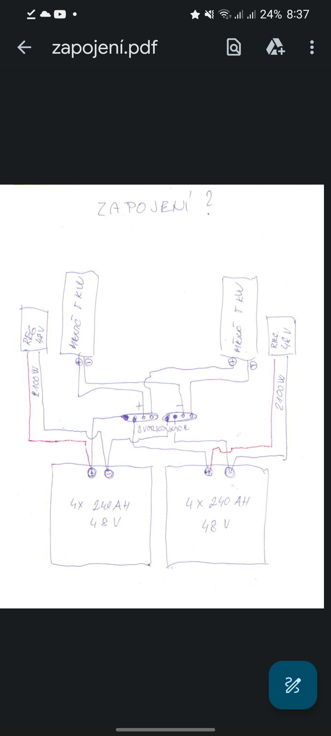 schémaBrumla píše:Zdravím všechny FV, potřeboval bych zkouknout paraelní zapojení dvou 48 V baterií, ale nevím jak obrázek mého laického schema dát na "sklo" poradíte??