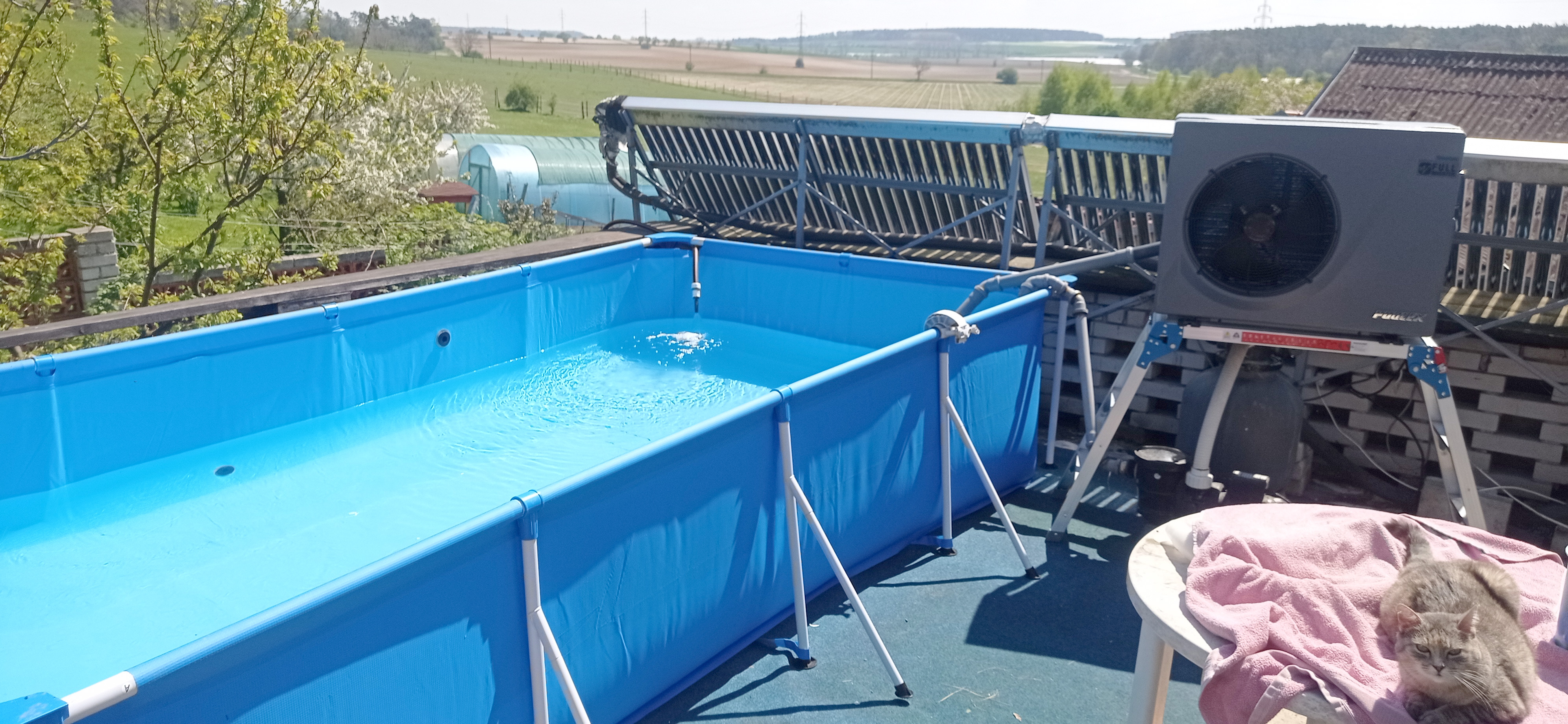 Z "bazénu" přebytky udělaly vanu o teplotě až 35 st.C. Ukazuje se, že není potřeba tepelné čerpadlo pouštět z baterií, protože voda za noc vychladne na cca 25 st.C a tepelné čerpadlo ji ohřívá rychlostí asi 1 st.C za hodinu. Podstatné je mít na hladině plachtu, aby se snížil únik tepla odpařováním. Mám nějakou koupenou s čerpadlem jako "Plachta na bazén pro oválné bazény 4,5 x 2,5 m". Od obyčejné stavební plachty se liší tím, že ji dodávají s lankem a rohatkou, takže se to dá kolem bazénu stáhnout a celkem dobře se s ní manipuluje (na zadní straně jsem ji přichytil k podpěrám pomocí stahovacích pásků). Snad vydrží aspoň sezónu - teda je potřeba aby zůstala nepromokavá a nelítala z ní vlákna.