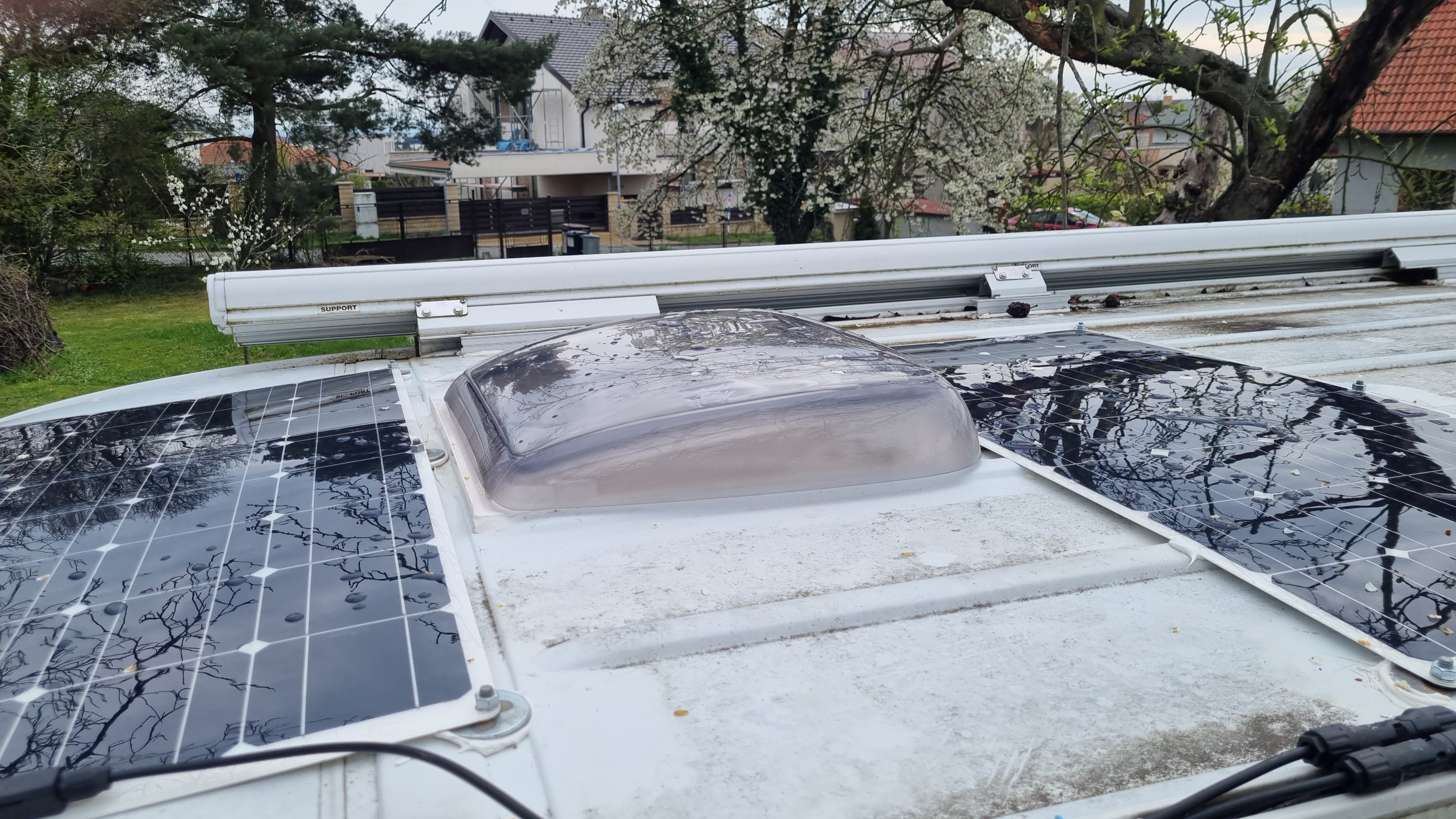 Foto nové FV elektrárny na expedičním vozidle.Koupeno na Ali jako set za cca 4000kč za 3dny dodávka.2x100Wp+Pwm +kabeláž.Celkem to funguje leze z toho 10A při 14V. Koupeno hlavně na dobíjené elektrokol ma cestách.