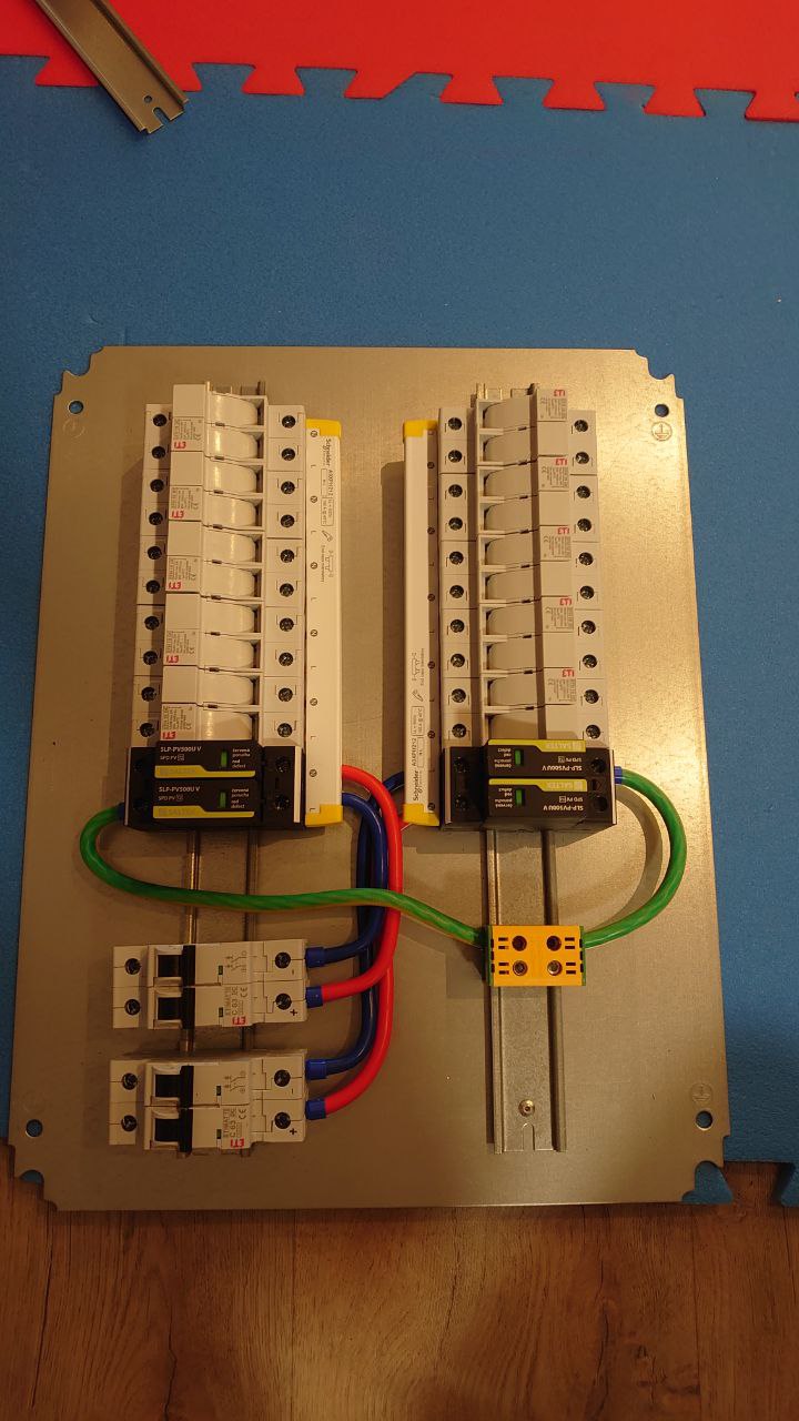 Nahoře se to ustálilo na pojistkách na jednotlivých částech, pak spojit na přepěťovku a z ní přes DC jistič s vyrážečem dolů. Jde o to, že když zareaguje přepěťovka, tak jde do zkratu, no a nabitý vstup regulátoru se pak natvrdo vybije do země - proto ten jistič (či další odpínač).