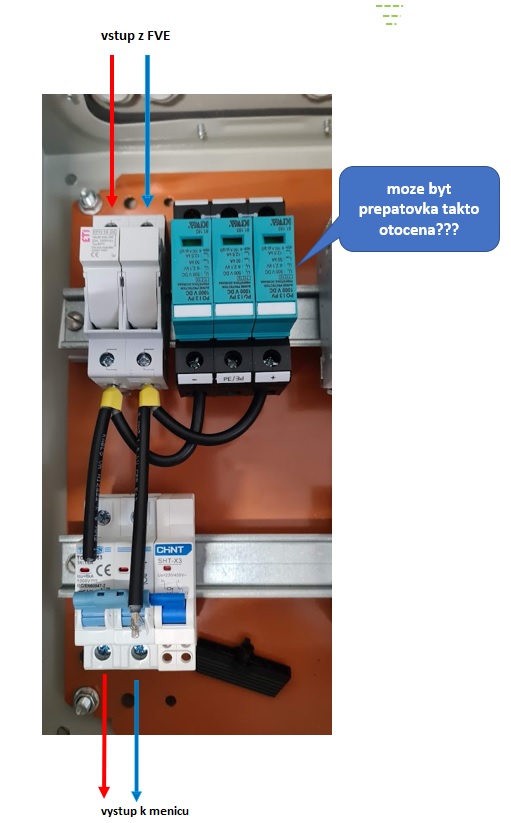 Dole pojistky, resp. odpínač, se hodí, když je potřeba něco udělat. Stringy do 120 V člověk klidně odšroubuje, ale cokoliv vyššího je třeba už korektně odpojit. A pojistkový odpínač se zkratovací vložkou místo pojistky vychází furt levněji než DC vypínač/jistič.