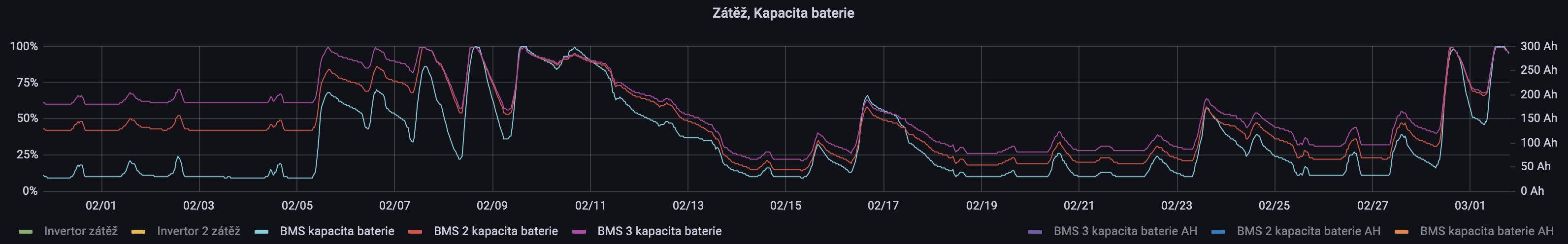 Velké driftování SoC na obou JK BMS bylo částečně korigováno 9 února, nicméně tento den ještě nebyly baterie dobity úplně na 100% SoC. Podruhé se baterie přiblížila úplnému nabití až na konci února. V březnu by už mělo určitě dojit k prvnímu kompletnímu nabití a balancování baterií po několika zimních měsících.