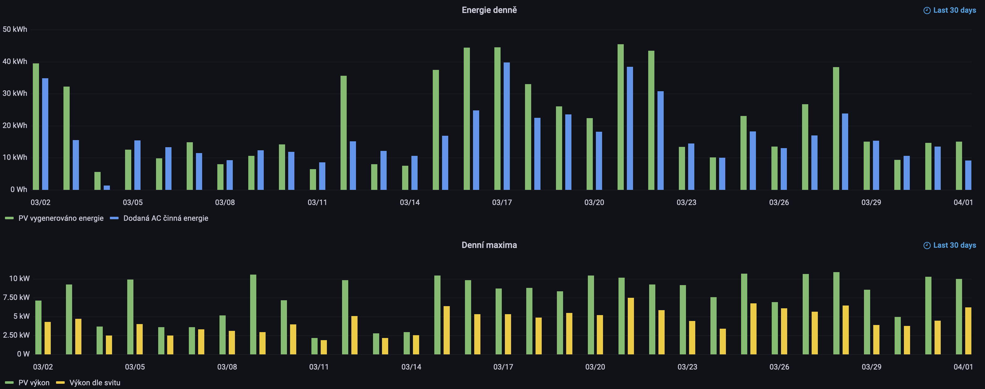 Maximální denní výroba se i přes občasnou oblačnost vyšplhala na 46 kWh, tedy 5.4 kWh/kWp.