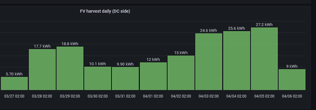 Dubnová výroba hodila 795 kWh, tedy dle předpokladu zase o něco více než březen. V dubnu se vyskytovalo stále hodně oblačnosti. Nicméně, když se některý den aspoň trochu vydařil, tak se vygenerovalo přes 50 kWh. Nejlepší dny už dávají i 60 kWh, tedy přes 7 kWh/kWp za jeden den. Po vylepšení vytěžování, jsem vyrobil a spotřeboval z FVE rekordní množství energie. Ještě loni v říjnu jsem nechával dost energie nevyužité ačkoliv říjen z pohledu FVE odpovídá přelomu března a dubna. Nyní se mi zatím daří vytěžovat z FVE úplně všechnu energii.