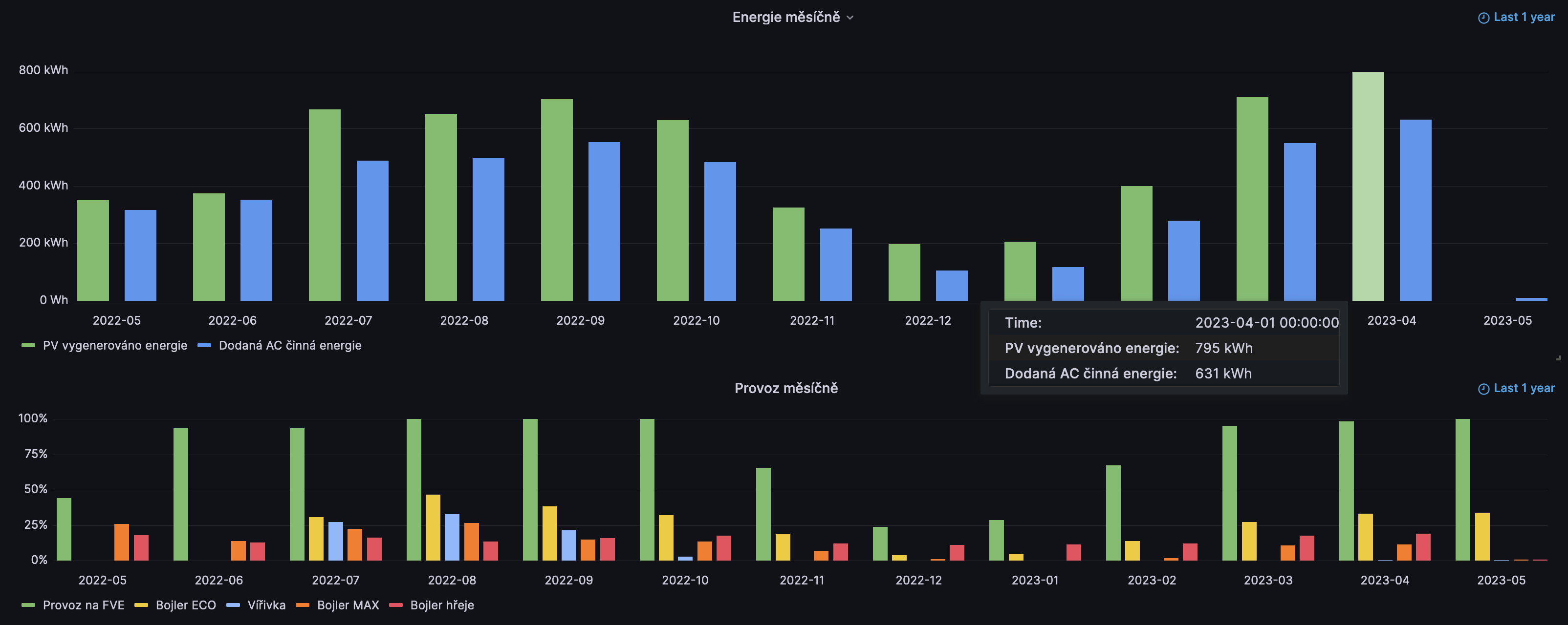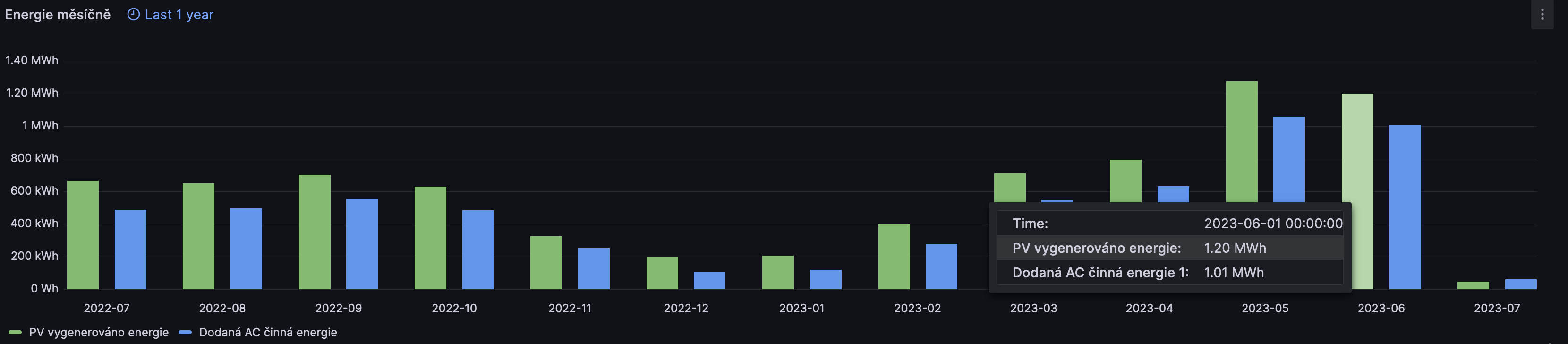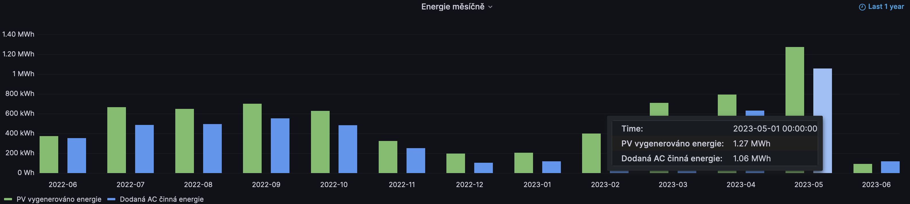 Konec května byl celkem produktivní a FVE v květnu celkově vygenerovala 1.27 MWh energie. Na distribuci jsem nezávislý už od konce února. MWh hranici měsíčně vygenerované energie z 8.56 kWp instalovaných panelů jsem prolomil poprvé. Za zhruba měsíc překročím hranici 10 MWh celkové vygenerované energie od počátku záznamu z mé instalace.