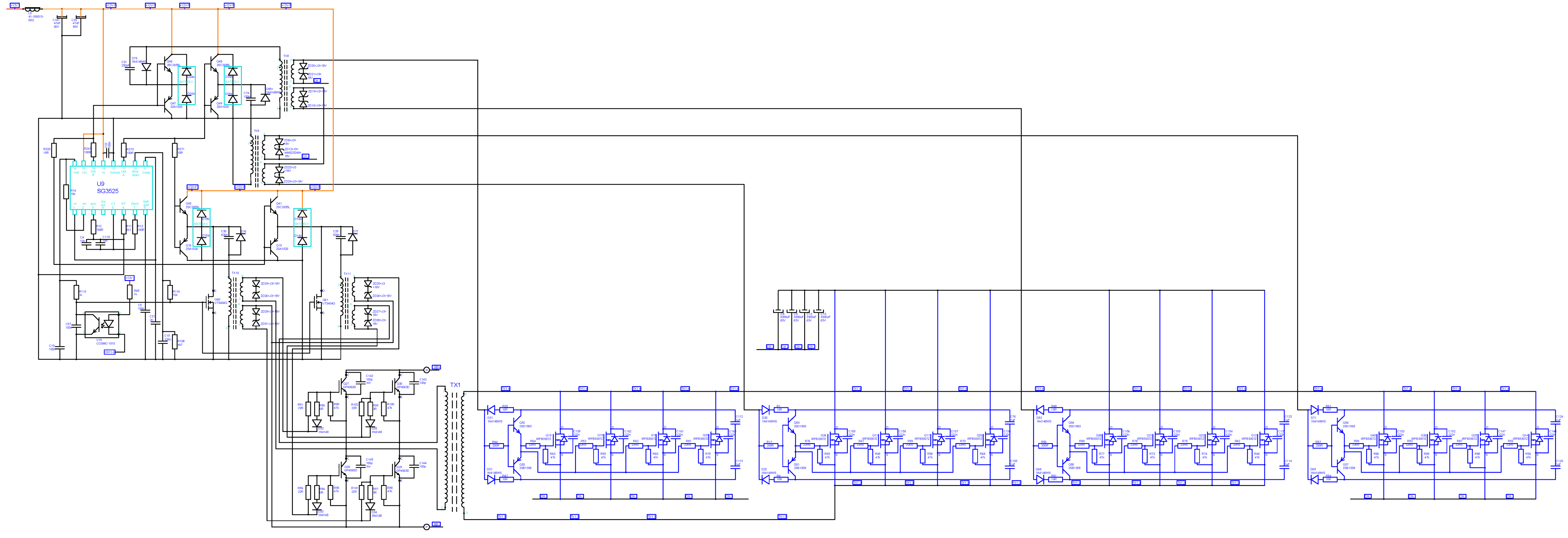 Pin 9 U9 je ground pro ten +12V. CH- je defakto mínus pól baterie za těmi čtyřmi tranzistory Q42-Q45 (samostatný chladič, první u mínus pólu baterie), které fungují jako ochrana proti přepólování baterie. Jsou otevřeny jen když je baterie připojena správně. Jinak nesepnou a měnič zbytečně neodejde přepólováním. CH+ je na kladné straně nízkonapěťových elektrolytů C8, C9 a C12, C13. Na CH+ je připojen kladný pól baterie přes zabudovanou 200A tavnou pojistku (v teto verzi měniče). Typy uvedených tranzistorů se v čase a podle různě výkonných verzí mění. Taky u slabších měničů bývají místo parallelních čtveřic třeba jen trojice a podobně. Ale zapojení, často i označení součástek je stále stejné. Vyrobci si to postupně vyklonovali včetně spousty hodnot součástek