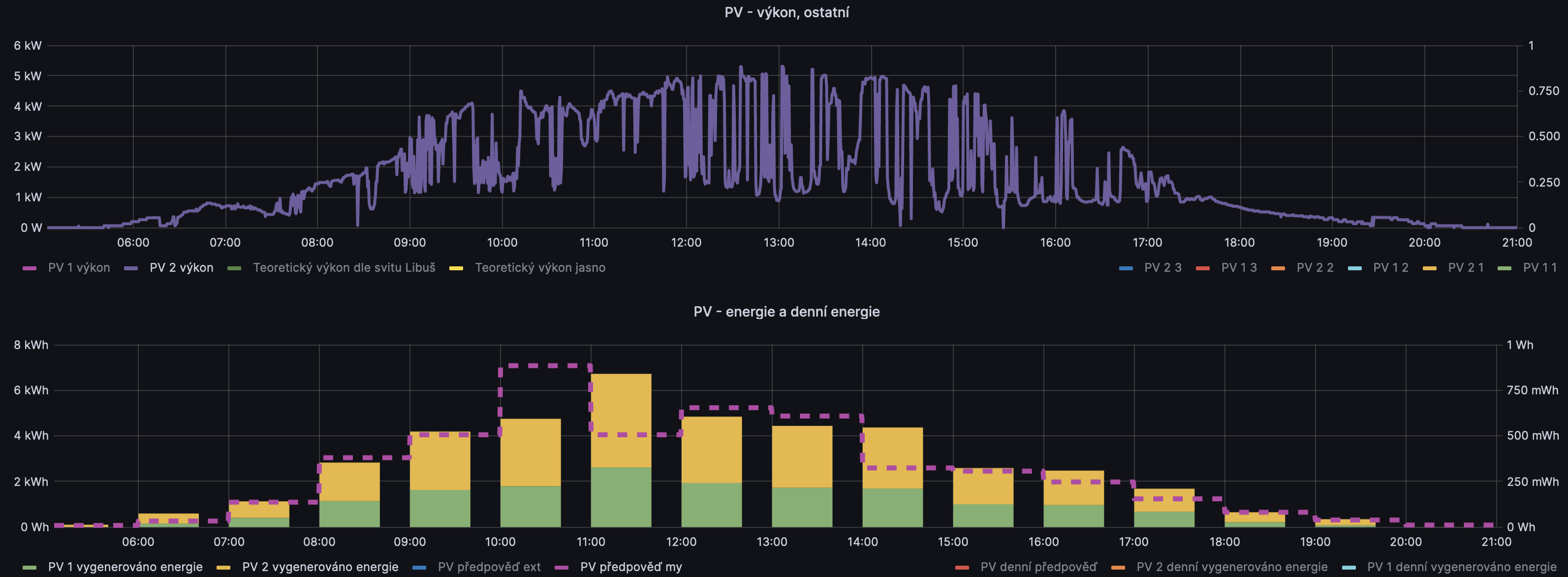 Pěkná práce, mám rád všelijaký sofistikovaný řešení, ale pro mě v zásadě žádný přínos, možná v několika dnech, kdy to počasí je hodně na hraně pro fungování v ostrovu. U nás v podstatě stačí to, že se ženská mrkne na přepověď počasí na další dva dny a podle toho organizuje praní prádla (taky aby to prádlo uschnulo, ne že nebude elektrika na vyprání) a to je celý. Víc než půl roku zůstává na střeše každej den minimálně 10kWh, pak to v přelomovejch měsích "tak nějak vychází" a další tři měsíce vlastně není co předpovídat, kde nic není, ani smrt nebere. Chystám se v nejbližší době vyměnit 18x260Wp poly za 16x370Wp mono - a to kvůli těm pár přechodovejm měsícům, zimu to stejně nevyřeší. Víc nemám šanci na střechu dostat, teda aspoň do doby, než zase vzroste účinnost panelů aspoň o 4-5 %...