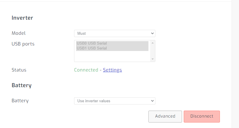 Tady je ukázka připojení dvou nezávislých měničů do solar assistant. V configuration v inverteru se dá disconnect, potom se zvýrazní oba měniče (USBo a USB1) a připojí.