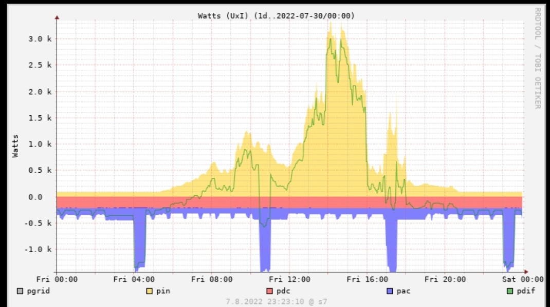 také nejsem doma a boiler dražice OKC160 s dvojitou patronou 2000/600W - 230AC/60VDC dotápí denně cca 1kWh . V 10:30 zapne na epsoláru DC výstup a zhruba po hodině a třičtvrtě to termostat vypne, nastaveno na cca 50°C