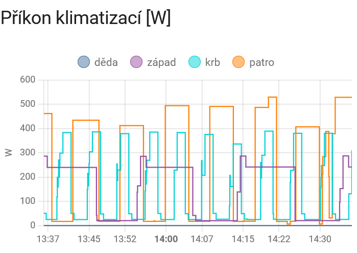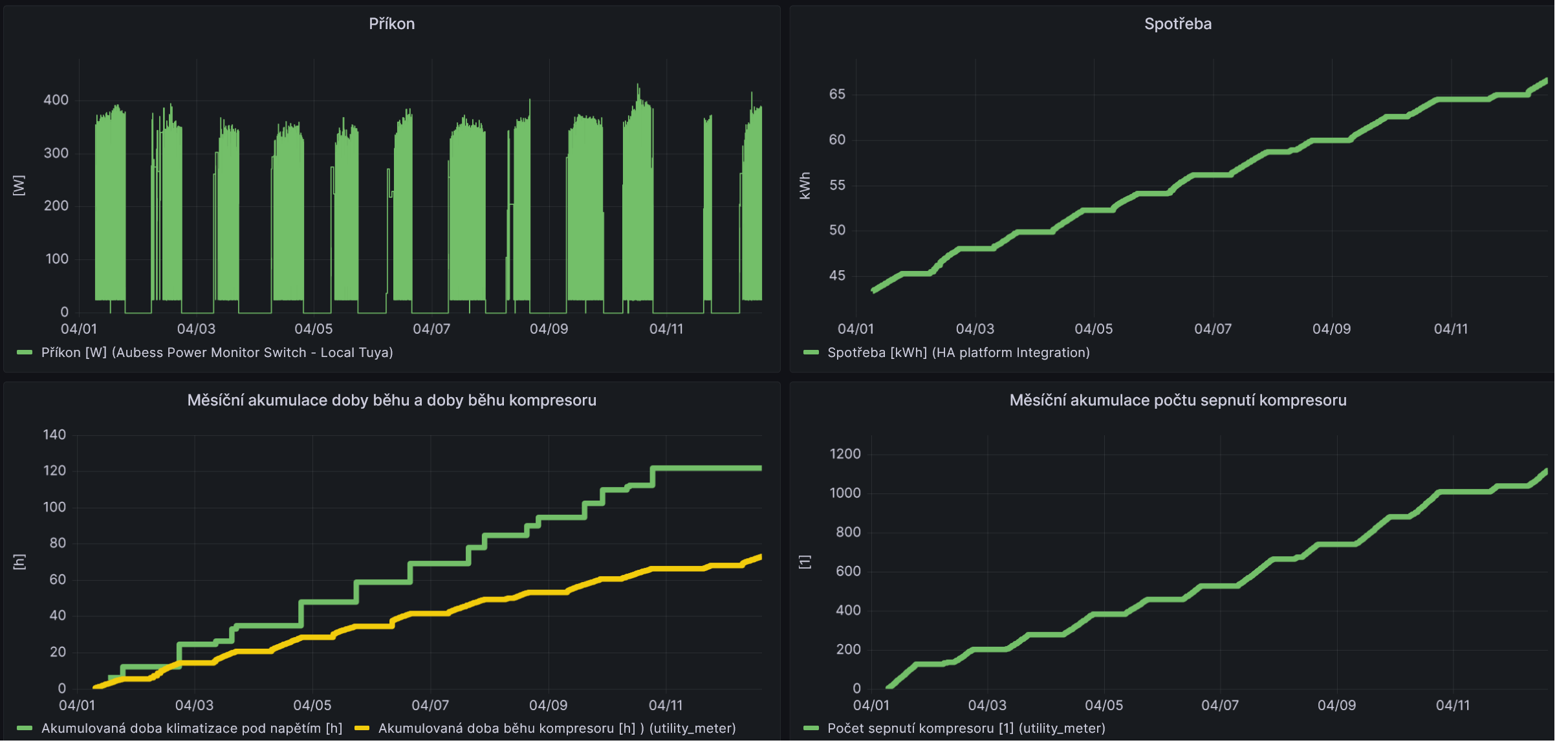 Končí zima a přestává se topit přebytky. Posílám to do klimatizací, DC podlahového topení, infrazářičů. U podstatných spotřebičů se sleduje příkon a další parametry a v případě nezvyklého chování jsou vypnuty. Například u klimatizací sleduji celkovou spotřebu, jak dlouho v měsíci běžely, jak dlouho běžel kompresor klimatizace a kolikrát kompresor startoval. U invertorové bych očekával, že regulací jeho otáček bude spínán méně často. Ale ten u krbu spíná častěji, než starší klimatizace ON/OFF, která je v patře. Nejsme ani v polovině měsíce a kompresor sepnul už tisíckrát. Asi je už tak malá potřeba vytápění, že to je mimo rozsah regulace. Uvidím jak se oteplí, jestli to bude při chlazení lepší.