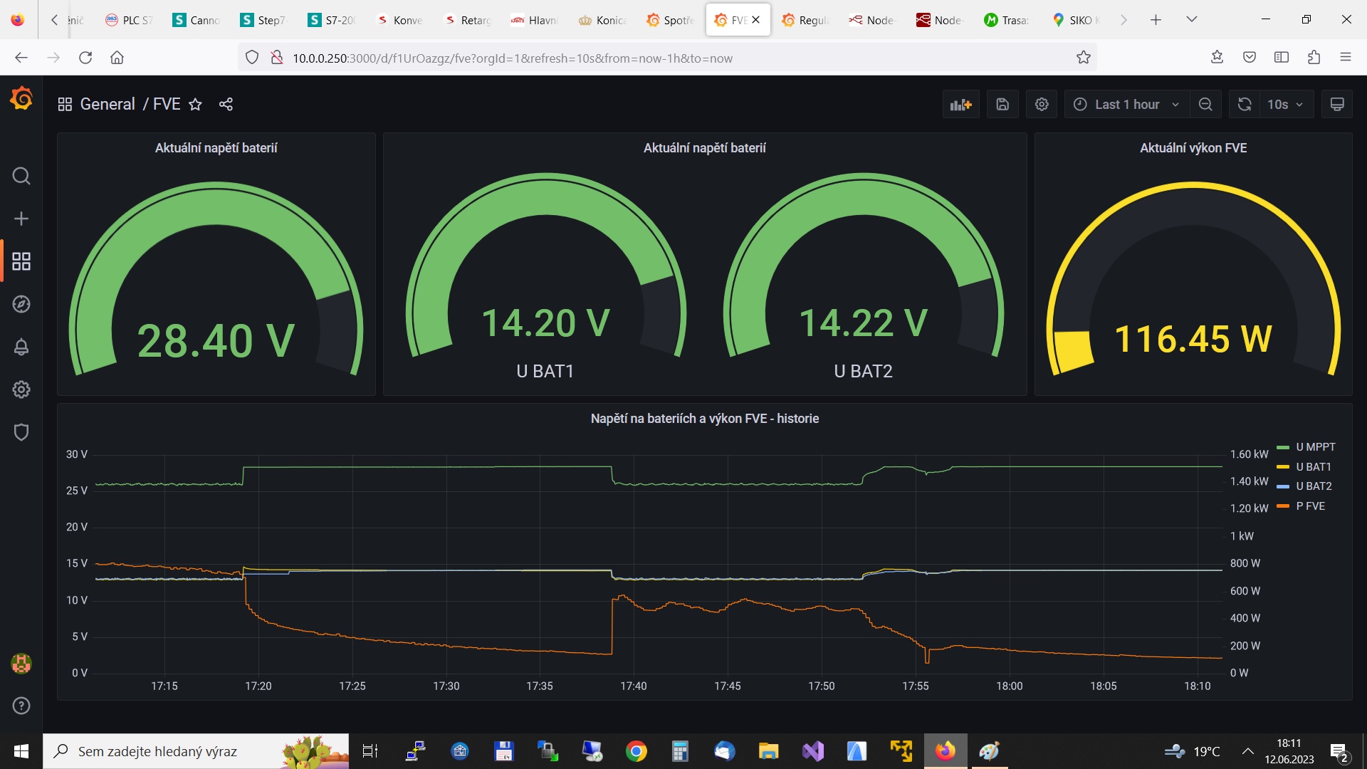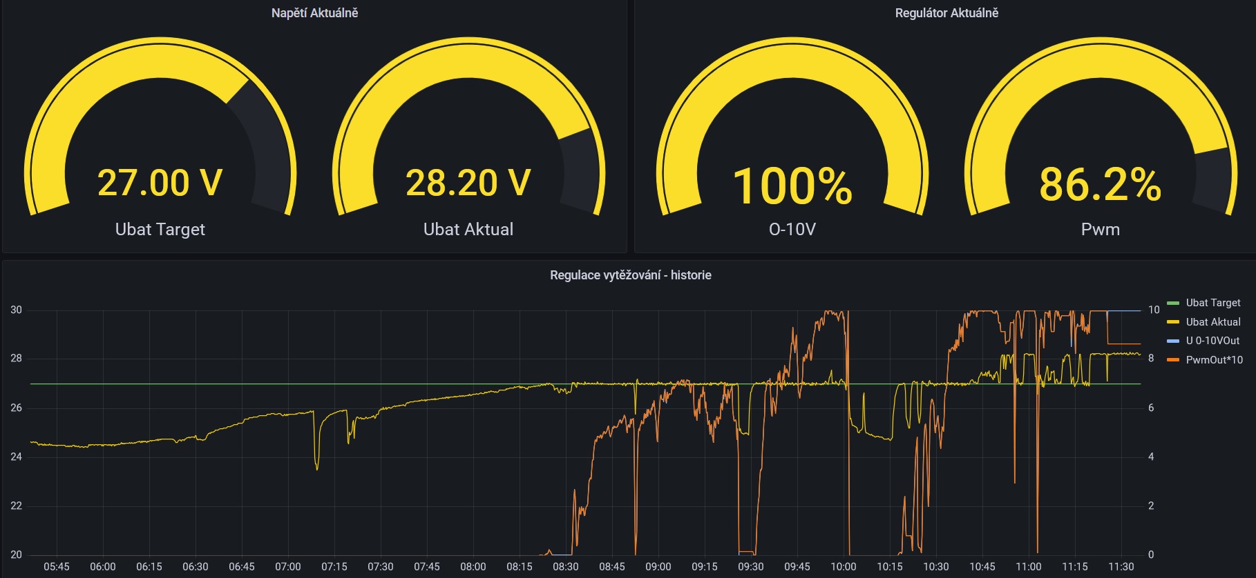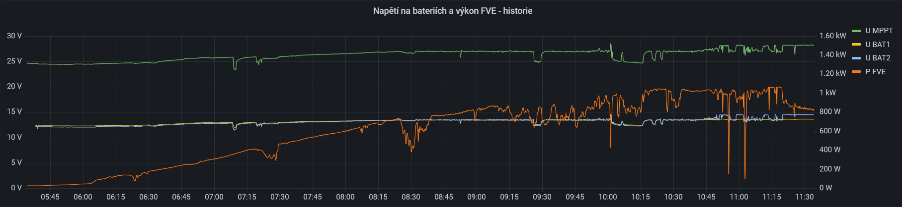 Včera jsem testoval vytěžovač a choval se dost nestabilně. Dnes ráno bylo ideální počasí (jasno), tak jsem provedl nové testy. Automatiku jsem změnil na poloautomat, abych mohl do regulace aktivně zasahovat. A zjistil jsem, že problém vzniká hlavně v okamžiku, kdy se blíží napětí na baterkách absorbci a do regulace začne zasahovat MPPT regulátor s nabíječkou. Když jsem napětí na vytěžovacím regulátoru snížil, tak se to začalo chovat stabilněji. Nějaký tip, jak to pořešit? Nechat napětí na baterkách v době vytěžování níž ? Nebo to pořešit nějak jinak?