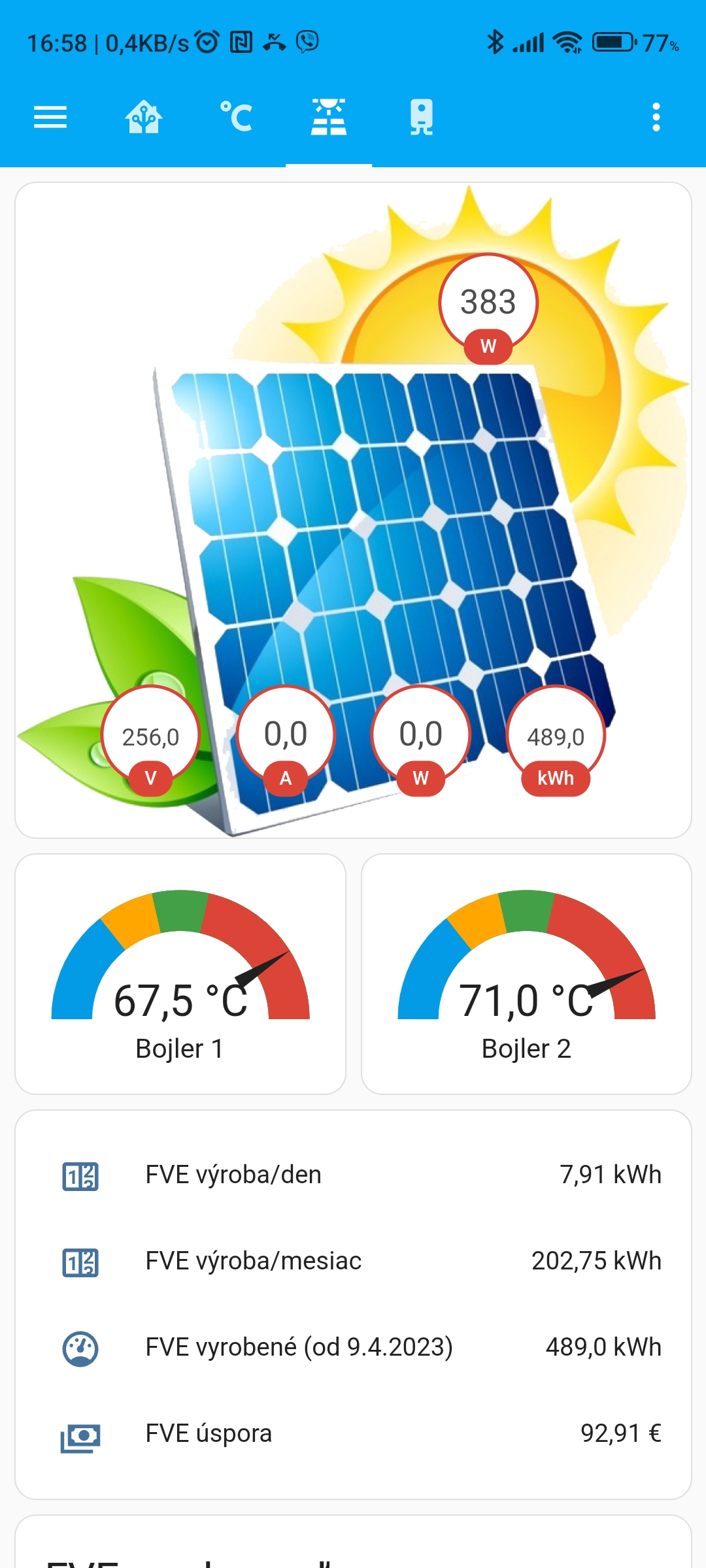 vecer vyrobenych 9,9kWh, jeden bojler 74C, druhy bojler 66C a vyrabalo sa az do vecera. aj ked od 16tej na znizeny vykon vdaka tienu.