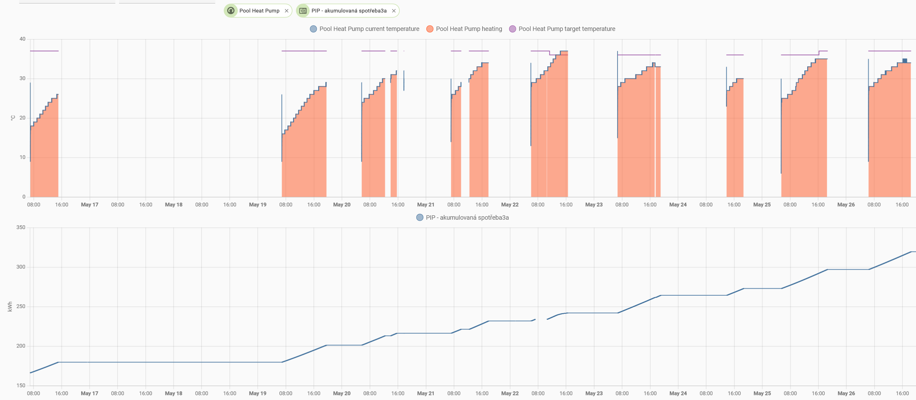 U nás se zahájila díky novému spotřebiči - tepelnému čerpadlu - koupací sezóna 30.4. Ale jde o bazének 5 000 l. Když počasí vede k přebytkům, spustí se s filtrací i ohřev. Za květen se spotřebovalo přes 300 kWh přebytků. Ale jak je venku tepleji, budu snižovat teplotu ohřevu, protože tam je večer přes 30 st.C a to není na osvěžení, ale na lenošení.