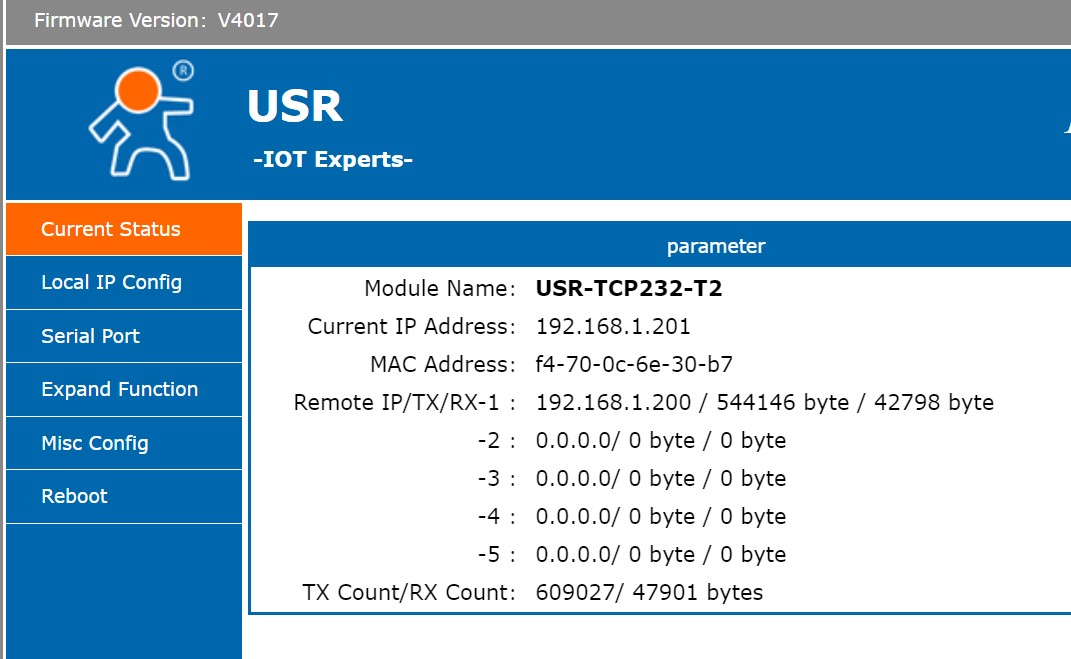 Abych měl převodník doma rychle a nemusel luštit čínské znaky, použil jsem převodník, který má na skladě LaskaKit, ač na Ali by byl levnější (pozor, jen pro sítě 10 nebo 100 Mb!): Nešachoval jsem vůbec s AT příkazy apod. Pomocí notebooku (s ad hoc nastavenou pevnou IP adresou) jsem v převodníku přes jeho webík nastavil IP adresu, funkci TCP klient atp. (poté nutno dát reset): V mém případě používám pro vyčítání dat PLC Foxtrot s nastavením příslušného kanálu "TCP server". Z Foxtrotu do BMS posílám JK příkaz "Vyčti všechna data". Dekódování mne ještě čeká, ale zdá se, že základ funguje, jak má: Funguje bez obtíží současně 4,3" displej JK BMS i toto vyčítání.