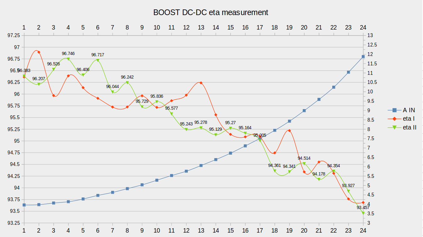 Tím, že účinnost je (U1*I1)/(U2/I2) tak se ti násobí nepřesnosti, tj pokud bys dokáazl měřit s přesností 1% proudy i napětí, tak na výkonu to bude 1.01*1.01=1.02 tj 2% a když tyhle hodnoty podělíš, tak může být nepřesnost zrovna ty 4% o který ti to skákalo. Tj nějak extra bych se s tím nezalamoval, když vlastně ani nevíš, jak ti přesnost měření ovlivNuje např vf rušení nebo nelineární průběhy napětí a proudu...