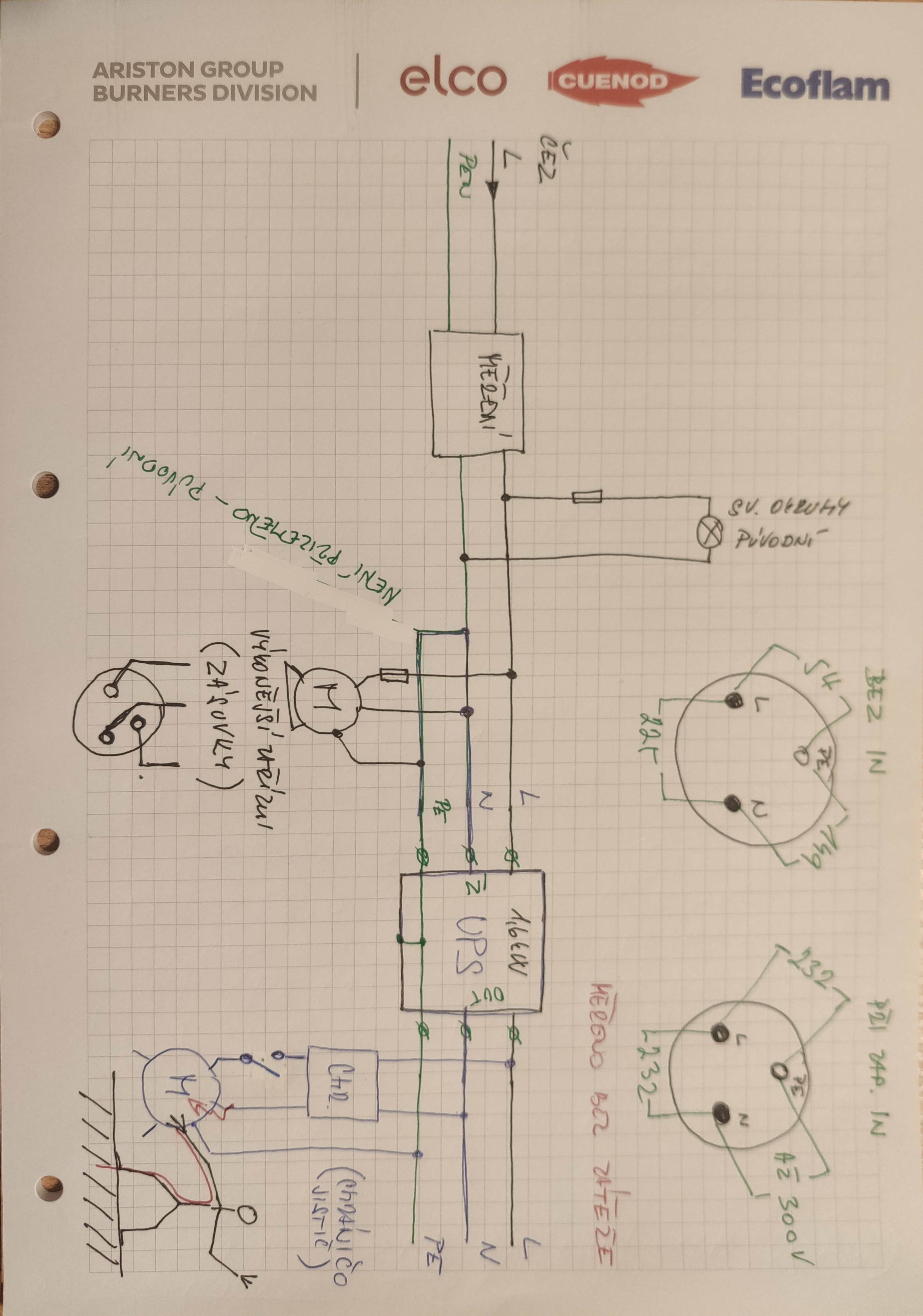 Posílám orientační schéma, je jen rukou. Je to 100 let stará chalupa a elektrika se tam dělala někdy v 70 letech . Ale je v mědi. A kupodivu rozdělená na okruhy. Přívod od ČEZ 230V bez uzemněného uzlu. Možná by to chtělo prizemnit. Uzel a spotřebiče za UPS.