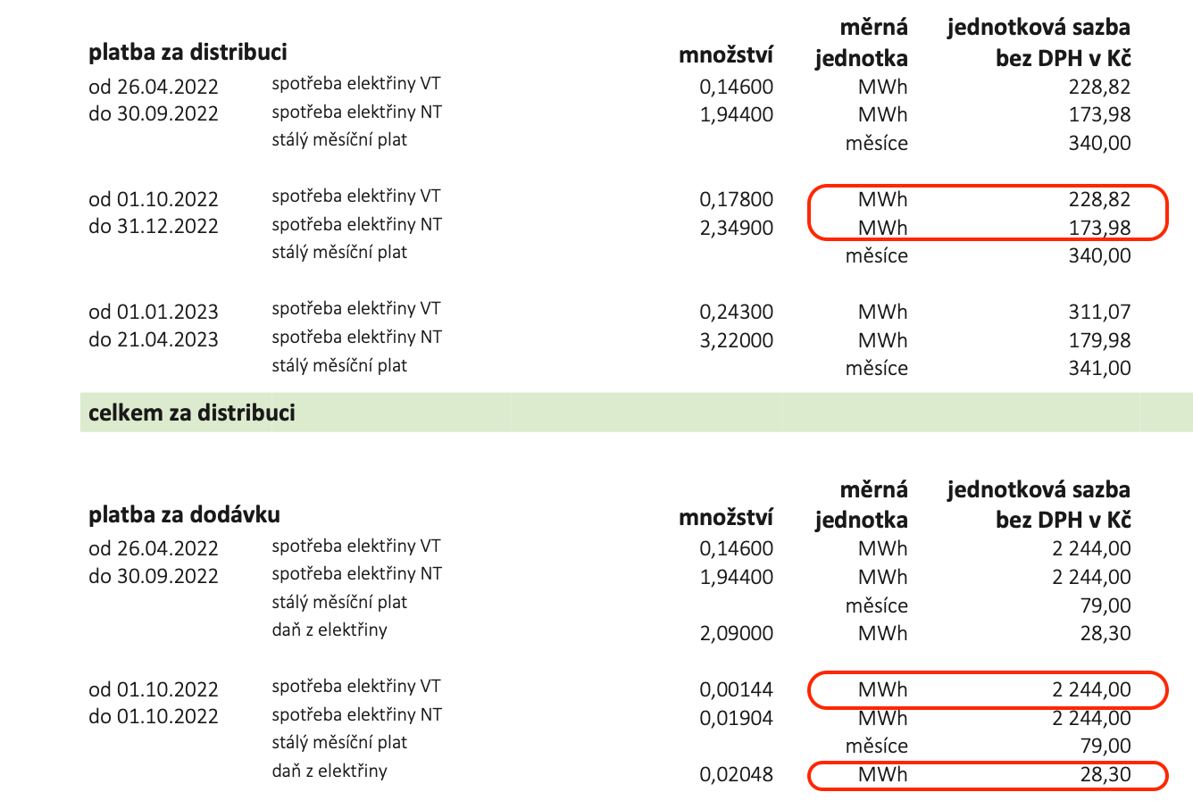 Tech 311Kc v mem vypoctu je distribuce, takze to mam i s cenou za MWh distribuce. Sorry nepresne jsem se vyjadril vyse ze "za dodavku". Jj, vidim tam to "Do 21.4" a ikdyz je to bizardni, tak nikde na fakture ani v aplikaci Innosvet nemuzu najit ceny aktualni :-) Pokud nekdo vi kde to najit, muzete dat vedet.