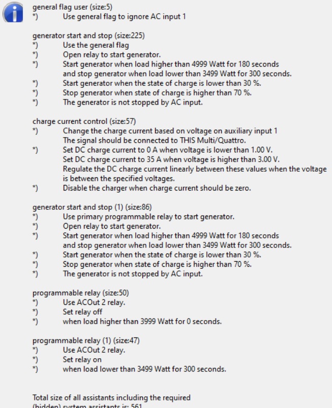 Ahoj zítra se chystám oživit FVE u rodičů. Pomocí AUX relé ovládám přepínač sítí, přepínám 1F FVE a 3F DS může být použit 2x asistent start generator? AC IN mám zapojený aby měnič poznal výpadek DS a měl možnost přepnout na měnič(UPS) při provozu na DS a jejím výpadku. AC OUT 2 mám zapojený na bojler aby se vypnul při zatížení měniče + zatím spínací hodiny aby v noci neohříval z baterek, časem bude nějaká automatizace už jen kvůli tomu že přijde dodělat i klimatizace. Nějaké připomínky co nastavit jinak?:-)Díky