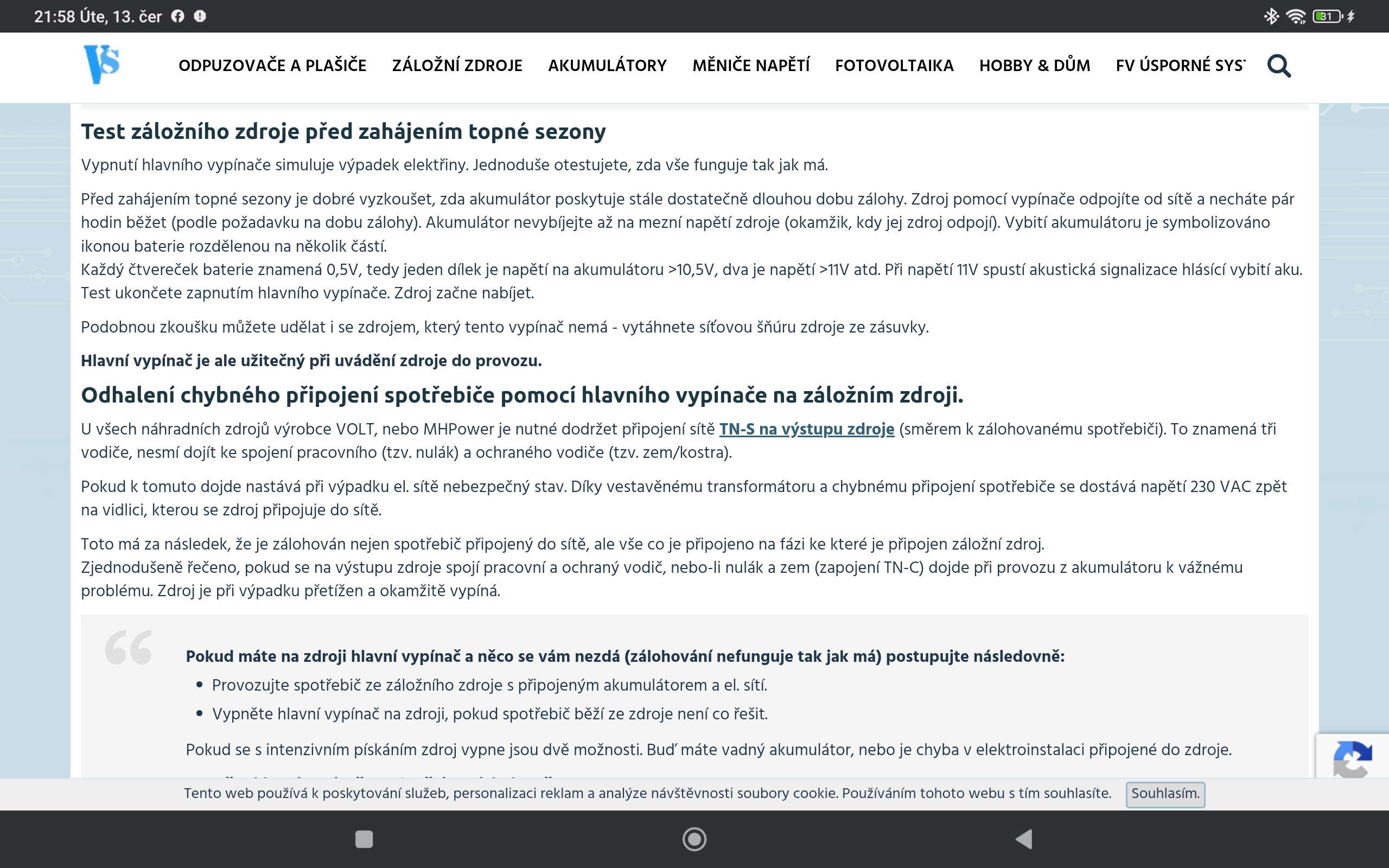 Proudový chránič musí být hlavně na výstupní straně UPS (pokud už není v UPS) a nejlépe na jednotlivých koncových rozvodech které napájí pokud je jich více. Jinak při případné poruše by UPS dál zásuvky napájela a s někým by to mohlo stále třepat.Termit píše:Toto je PrintScreen jedné z několika rad technické podpory výrobku. Tolik o spojováni N a Pe na výstupu u tohoto střídače. Dokonce mi jeden monter od prodejce doporučil že mam dát chránič na vstup pred měnič, že to tak standardně montují....Na výstupu je to prý blbost.....[