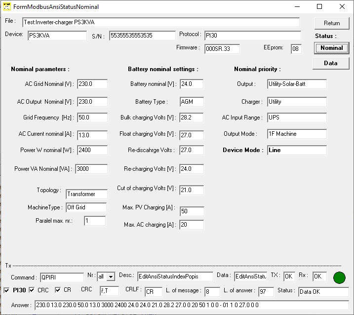 Dokončil jsem opravy a doplňky ve verzi programu Modbus30 Ansi protokol PI30 pro řadu inverter/charger PS1-5KVA a na odzkoušení datových funkcí programu sem dávám vylepšenu verzi Modbus30demo, kde je opět eliminována komunikace přes porty.