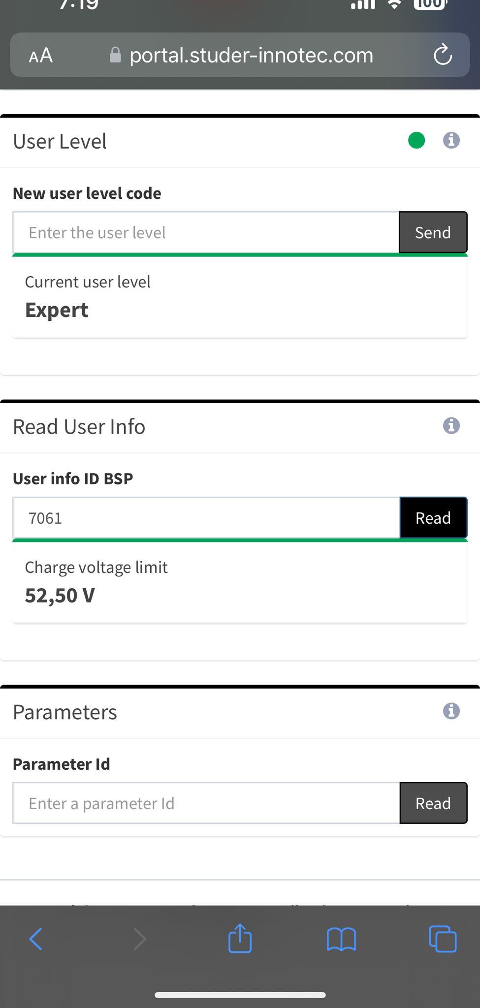 parametr 1109 musí být níže než p.1110 , nebo p.1108.stasfurt píše: sob říj 07, 2023 8:44 pmAhojte potrebujem poradiť.Ako nastaviť xtm??mám LG chem Liion 12s 156ah a treba nastaviť undervoltage?ide mi nastaviť min 48v ale ja potrebujem este menej.Viete poradiť ake hodnoty tam treba nastaviť ?? ďakujem