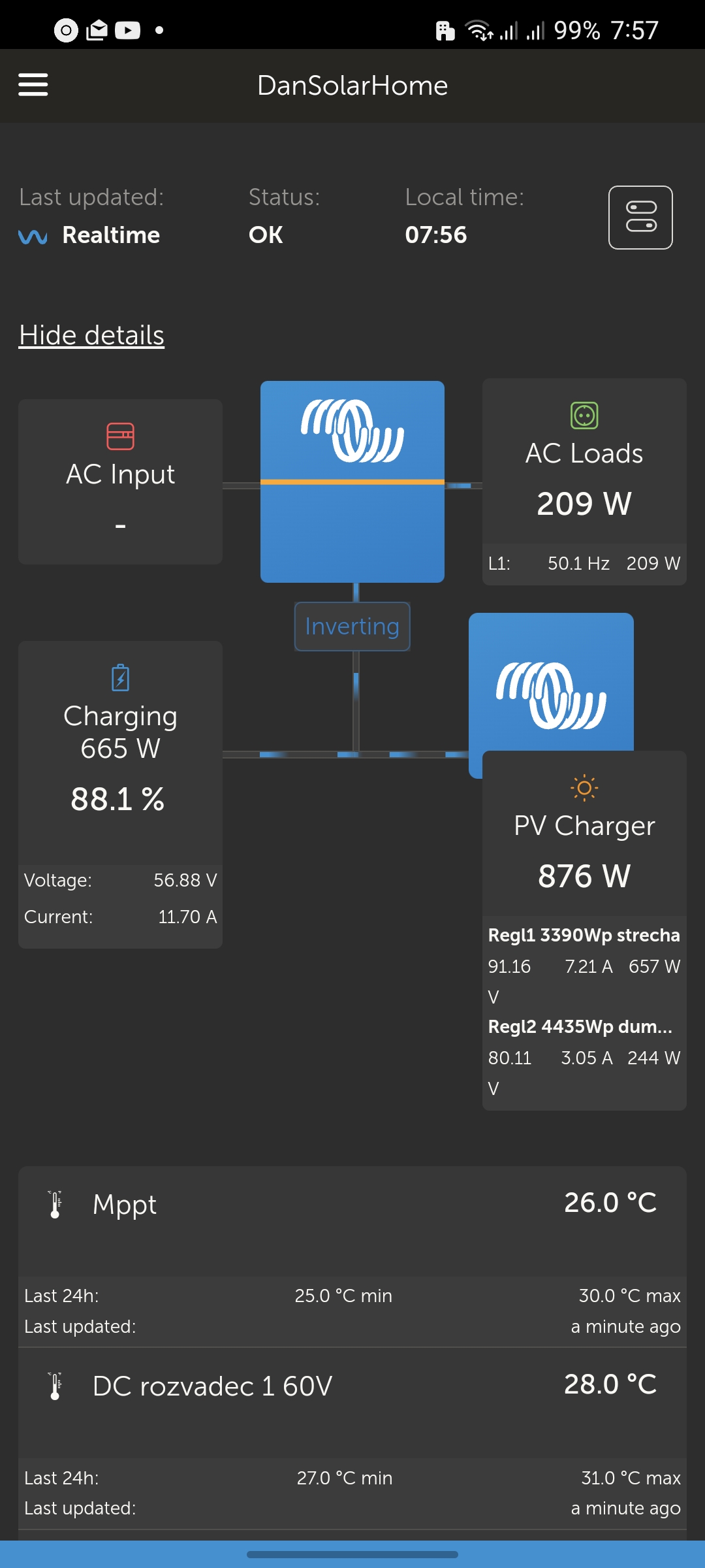 To iste u mna.. kazde rano baterka cca 80% vecer plna a tiez nepozeram predpoved.podarilo sa mi zohnat este dalsie aku teke ake mam teraz tak som zvedavy na zimu a slubujem si od toho ze by som mohol vyzit cez tu zimu no uvidim..este su neni v systeme dostanem sa knim tak v septembri..ked to tu tak citam a baterky vam nevydrzia a prepinate na siet tak to si neviem prestavit kedze umna sa barskto uz cudoval ze ako to je mozne ze aj vtakomto pocasi mam bat na 100%Dagus píše:Tak to já ani zdaleka na ds nemyslím. Každé ráno je nudnější a nudnější. Mraky, déšť, hnus a ráno nezačínám níž než na 80%. Absolutně nic neřídíme podle slunce. Druhá baterka dala manželce volnost, používá kdykoliv cokoliv. Typicky celý den nikdo nic nedělá a večer myčka, pračka, sušička, vyprázdní bojler a teď si trochu pustí klimu na topení. No a i tak je to ráno zas nuda. Každý i hnusný den vidím 100% v aku.