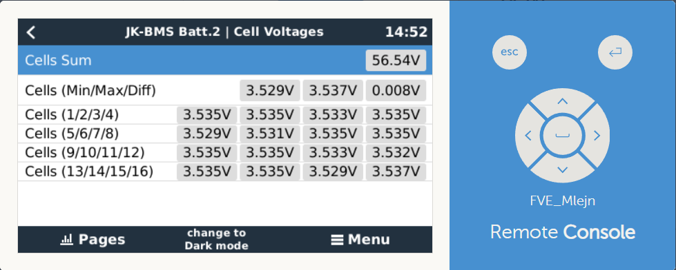 Pro kompletní synchro 100% SOC jsem si nastavil na Victronu Absorption na 56,80V a Float na 56,4V. JK-BMS propojeno na VRM pak sleduji, co to dělá s články. Napětí pro balancování nastaveno na 3,0V, tedy vlastně skoro trvale. Rozhoduje jen napěťový rozdíl mezi články.