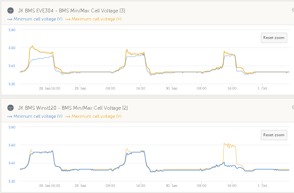 Tak FVE dnes opět překvapila. Sluníčko celý den, takže proudu dostatek. Práce také, takže na nějaké laborování s nastavením BMS nebyl čas... a pohledem na graf odpoledne zjišťuji, že se situace neopakovala. Naopak, dochází k téměř ukázkovému balancování obou baterií, tedy jak EVE, tak i Winston na cca. 10 mV.